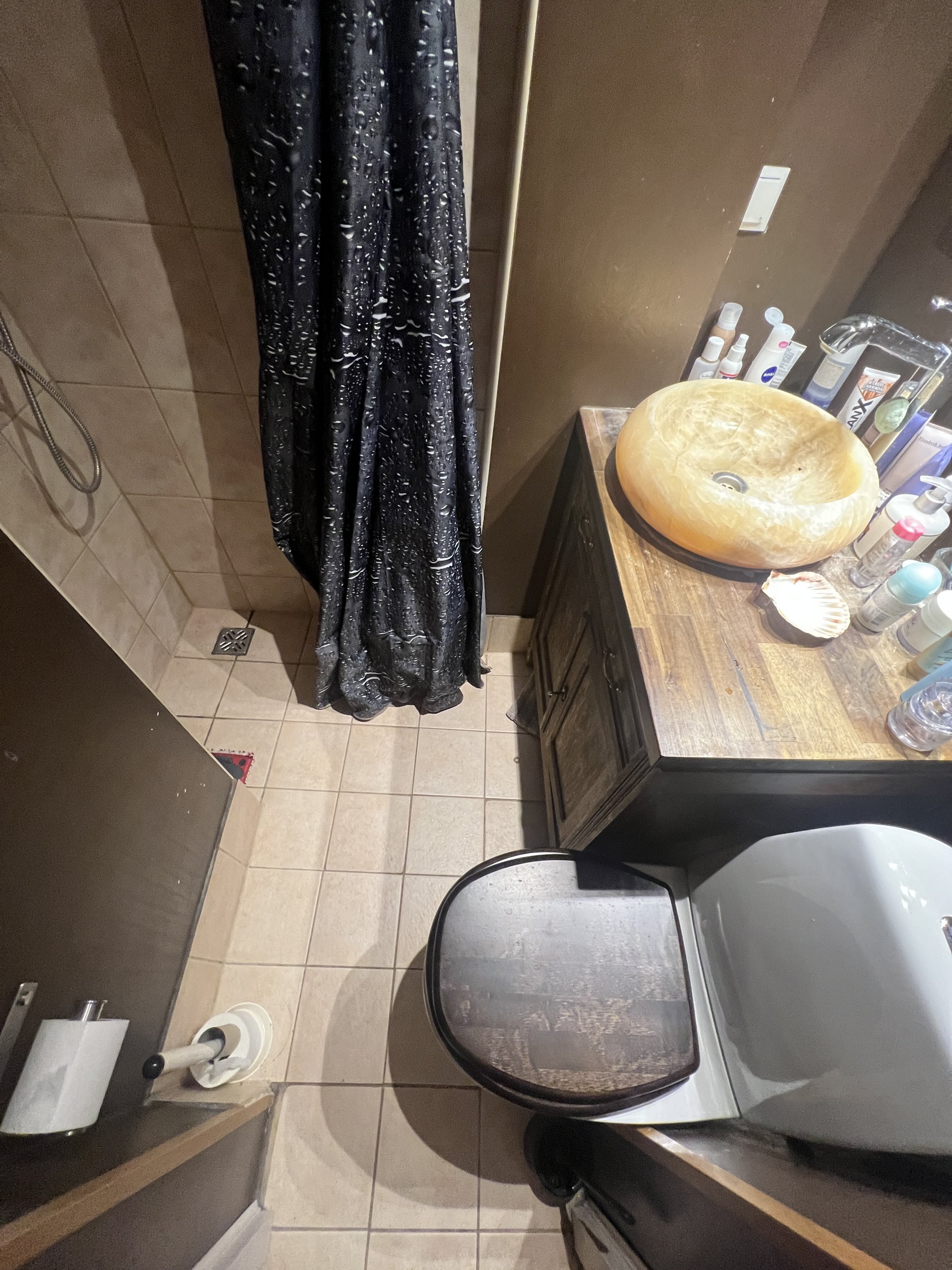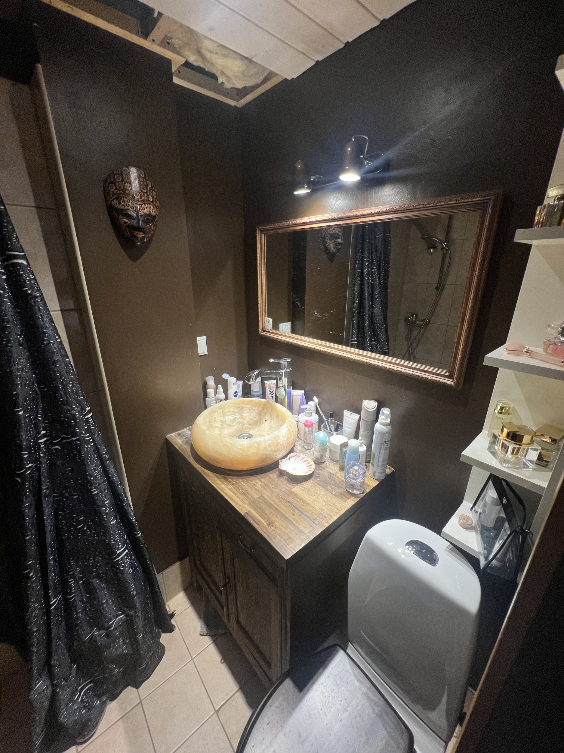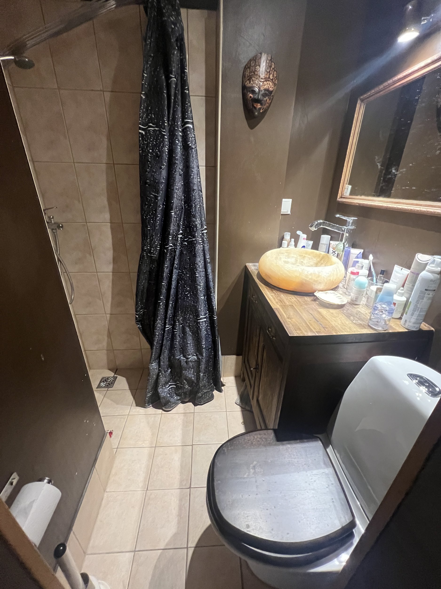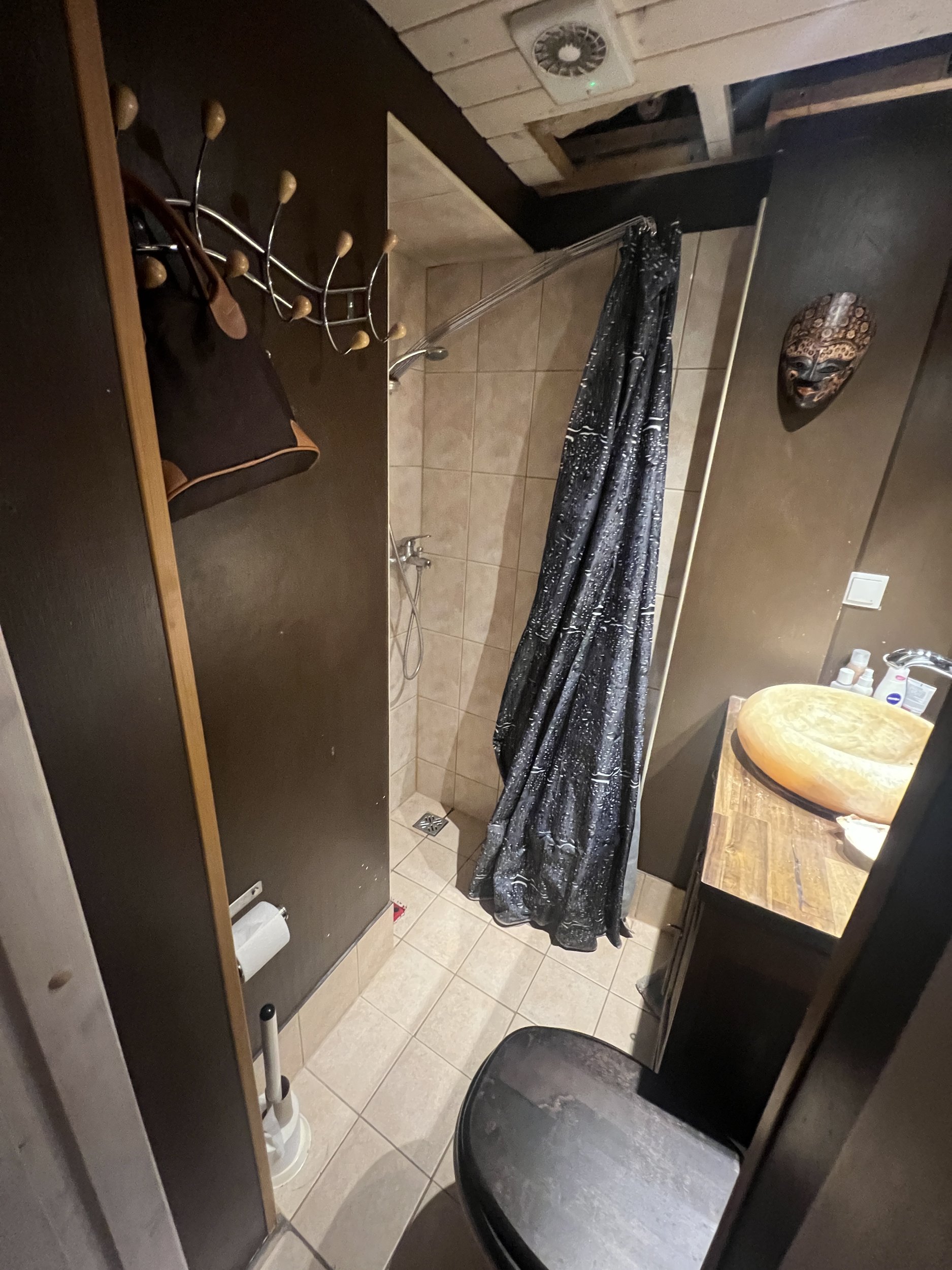 -plaadid, duššiuksed, seinapealne valamukapp koos kraanikausiga, seinapealne WC-pott, boiler, segistid, trapp