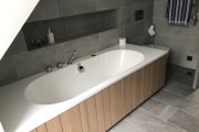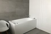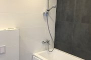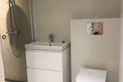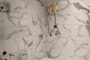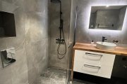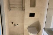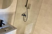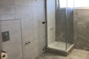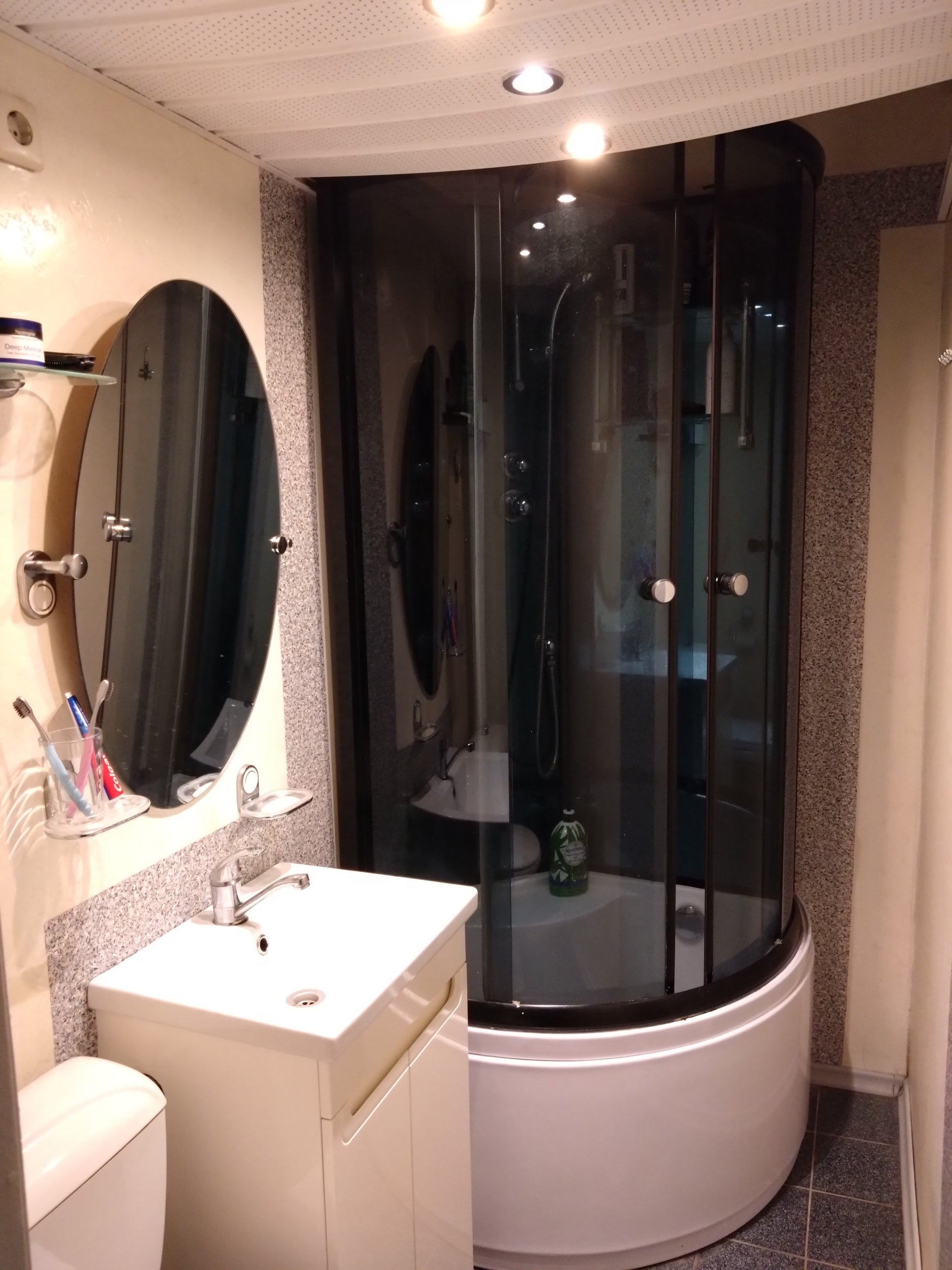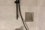 Duššinurk kõrgemale alusele, eraldatud klaasseinaga, tagaseinas riiul seinasüvendisse.