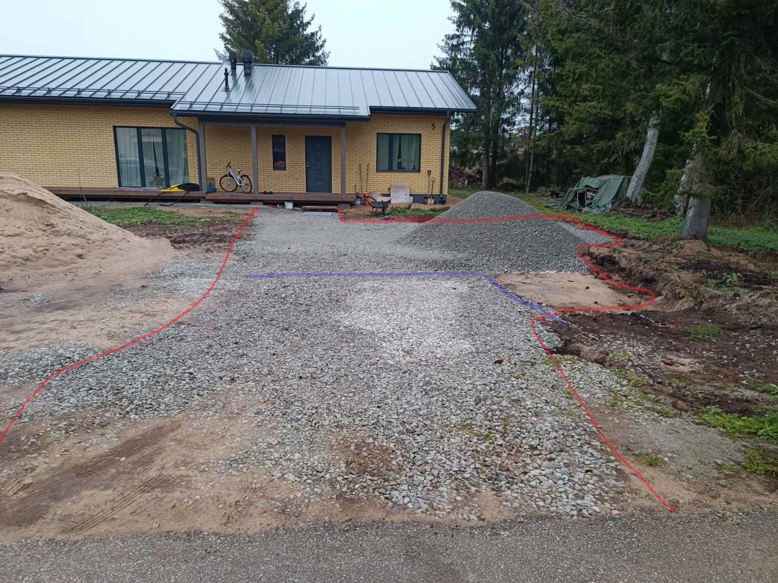 Tagaosa (vt foto) ettevalmistatud (liiv tihendatud + killustik 200mm tihendatud). Esiosa ehituse käigus paigaldati olemasolevale pinnale killustik.