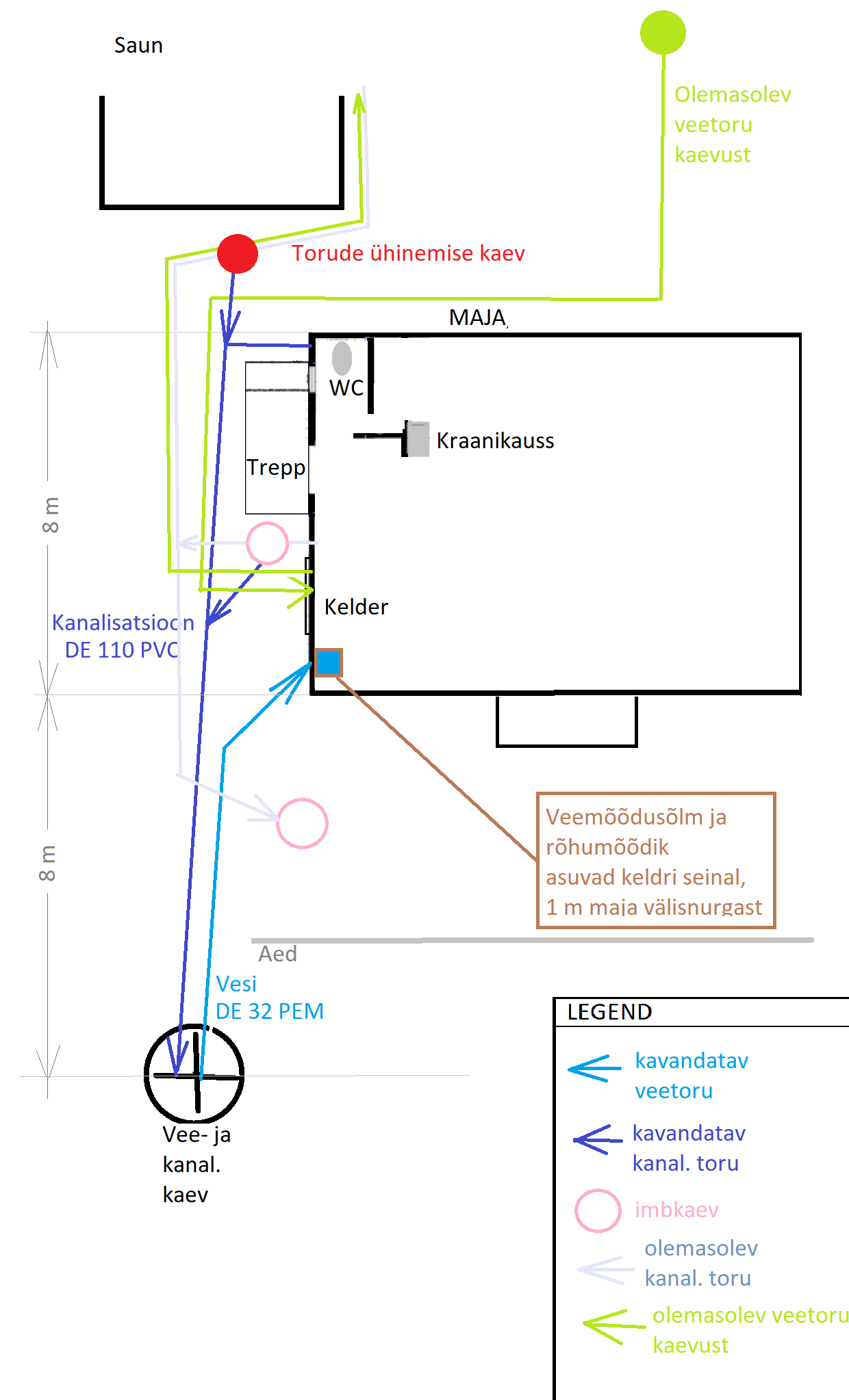 Majast väljas tuleb maa alla kanalisatsioonitorud kaevata umnes 17 m ja veetorud 8m pikkuselt, need tuleb ühendada olemasolevate torudega. Kanalisatsioonitoru läheb käimlasse praeguse lampkasti kaudu või puurides läbi 45 cm paekivimüüri. Veetoru läheb keldrisse, puurida auk läbi 45 cm paekivimüüri, keldri seinale tuleb sellel kohal paigaldada veemõõdusõlm. Keldrist läheb veetoru üles tuppa (betoonlagi), toast läbi puitseinte kööki ja käimlasse. Õues tuleb kanalisatsionitoru ühendada saunast tuleva toruga ja selle kohale teha kaev malmkaanega. Köögist ja käimlast minevad kanalisatsioonitorud ühinevad õues. Kööki tuleb 10L boiler. Köögi valamau ja kraan olemas.