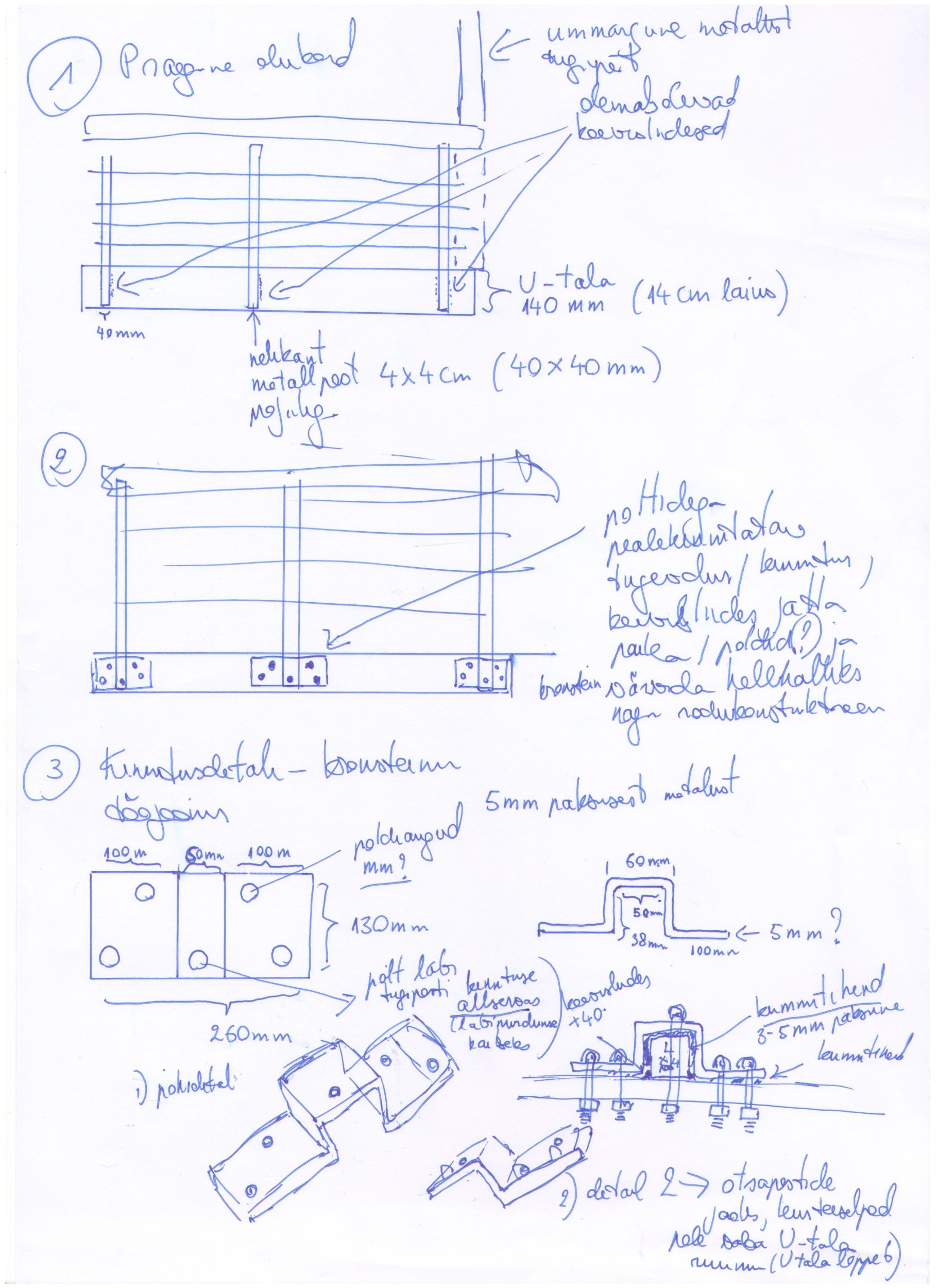 1. Kinnitada rõdupüstaku kõigi 6 rõdude käsipuude 40x40mm metallist tugipostid (kolmnurkrõdudel Ttn pool 3 posti, garaazi kaldtee kohal 5 posti, kokku 8 tugiposti iga rõdu kohta, millega on kinnitatud käsipuu, kokku 48 tugiposti) üle metallist kronsteinide/nurgikutega poltide abil, jättes olemasolevad keevisliidesed alles, kinnitus lisada tugipostide peale (ekpertarvamuse p 2.10., 2.12 sobivaks peetud lahendus). Tööd on tõenäoliselt teostatavad üksnes väljaspoolt tõstuki abil, v.a. juhul kui talasse ava puurimine ja kinnituse poltidega kinnitamine on teostatav rõdul olles seestpoolt (redeli ja rakmetega?). Iga 40x40mm käsipuu tugipost kinnitada jäigalt üle tugiposti ulatuva ca 2-3mm paksuse kronsteiniga tugiposti kandva T-tala külge 3-5 poldiga, mille diameeter on 3-5mm (skemaatiline joonis lisatud, ehitajal kontrollida mõõdud üle kohapeal, poltide läbimõõdu ja kronsteini paksuse täpne mõõt määrata kindlaks ehitajal).