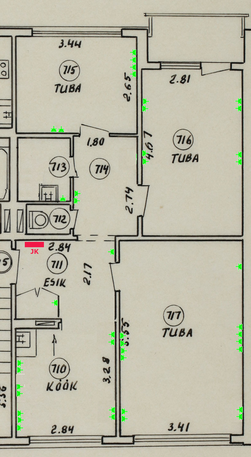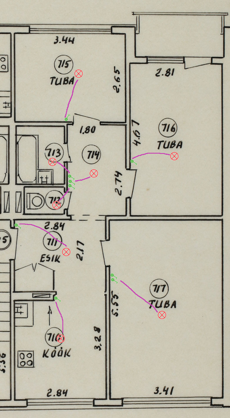 Eesmärk: Välja on vaja vahetada kogu juhtmestik, pistikupesad, lülitid, teha korterisse eraldi kilp. Lülitid tuleks tuua allapoole (1m kõrgusele põrandast), sama lugu ka kõikide pistikupesadega (30cm põrandast). Kuna hetkel on põrandad üles võetud, saab enamus uuest juhtmestikust vedada põranda alt. Lisan pildid korteri plaanist ja pistikupesade, lülitite ning valgustite võimalikust asukohaga. Kuid kindlasti olen hea meelega nõus seda vastavalt elektriku soovitustele muutma/kohandama.