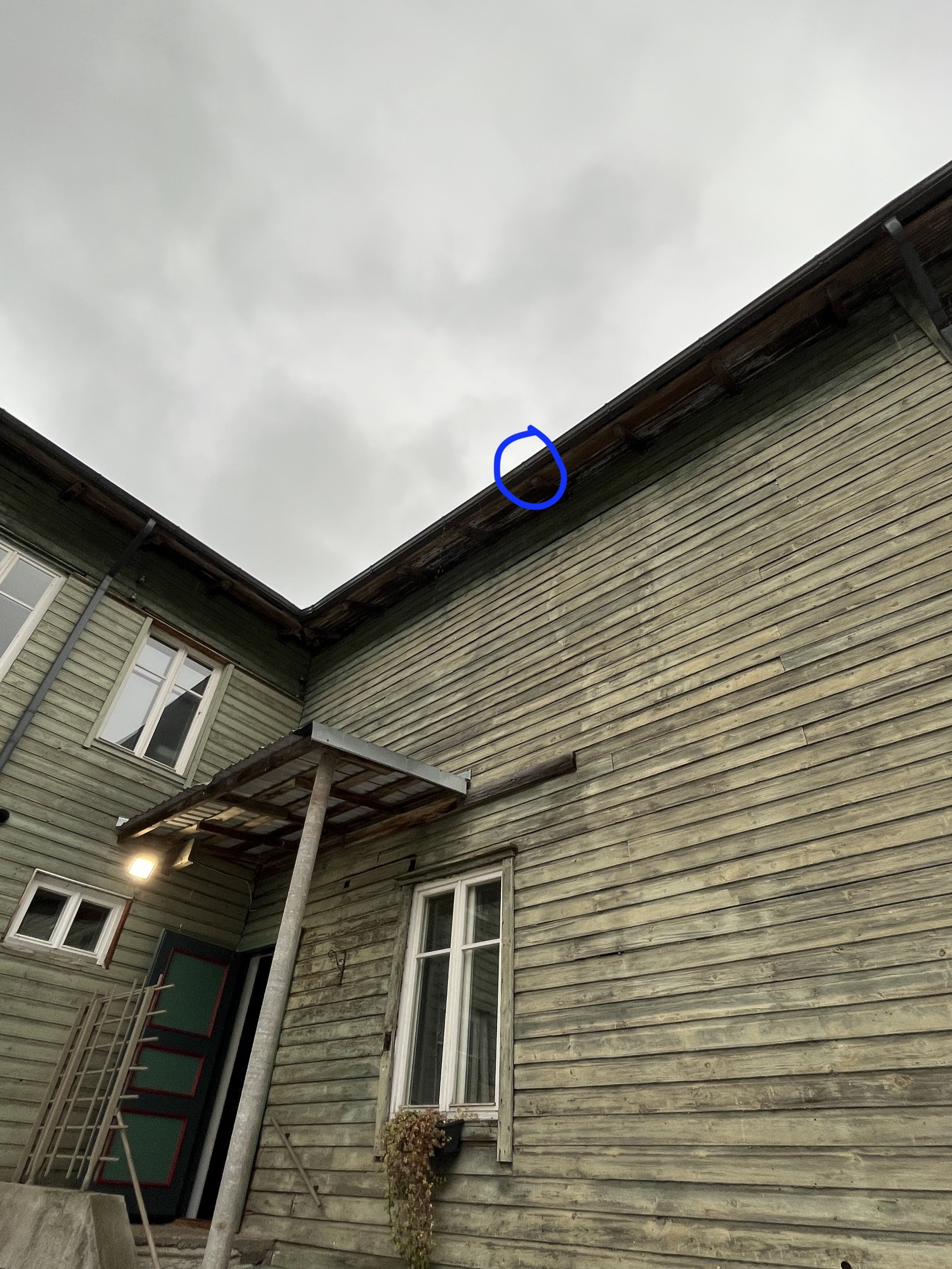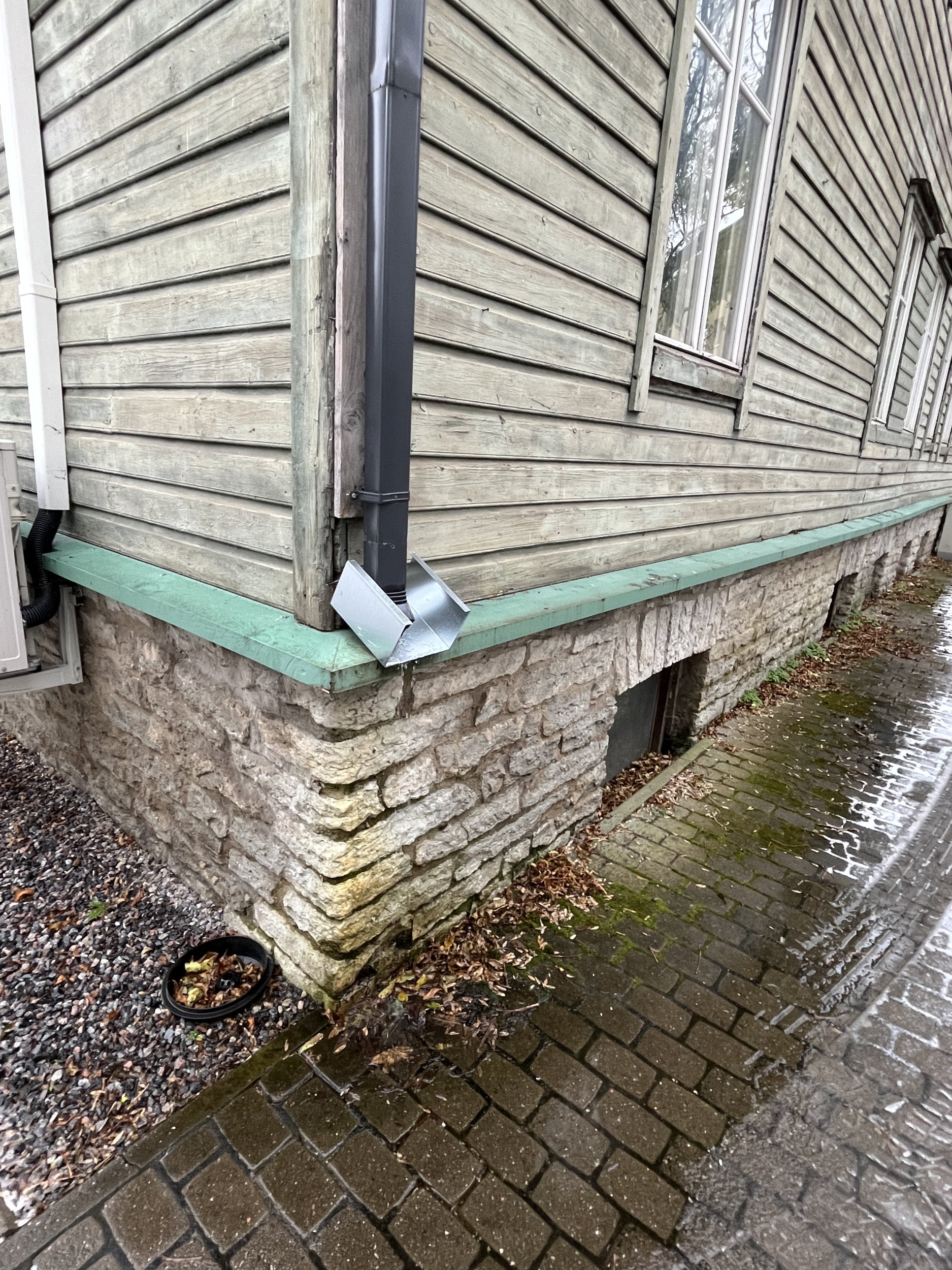 Tarvis on hermetiseerida üks läbilaskev vihvaveerenni liitmik (fotol markeeritud sinise ringiga), parandada üks allajooksudest (fotol, tuleb vähemalt kahe põlve abil tuua maja külje poole, et ei jääks maja nurka suuremate autode pööramist segama). Vajadusel vihmaveerennid puhastada (u 16 m) reguleerida/ kalded korrigeerida (võivad olla talvel jääga paindunud, silmaga paistavad küll korrektsed). Räästa kõrgus on u 6-7 meetrit.