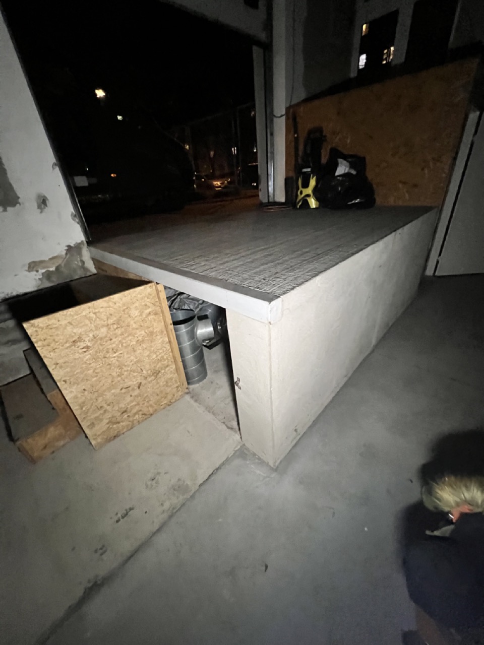 Hind sisaldab platvormi demonteerimist vajaliku suurusega, mittevajaliku betooni taaskasutamist ja metallkarkassi paigaldamist ülejäänud platvormi osa alla. Platvormi alla pääsemiseks soovitame paigaldada uksed nii, et platvormi otsaosa ei jääks avatuks soovimatule prahile ja muule. Juurdepääsuukse materjal võib olla ükskõik milline, mille valite