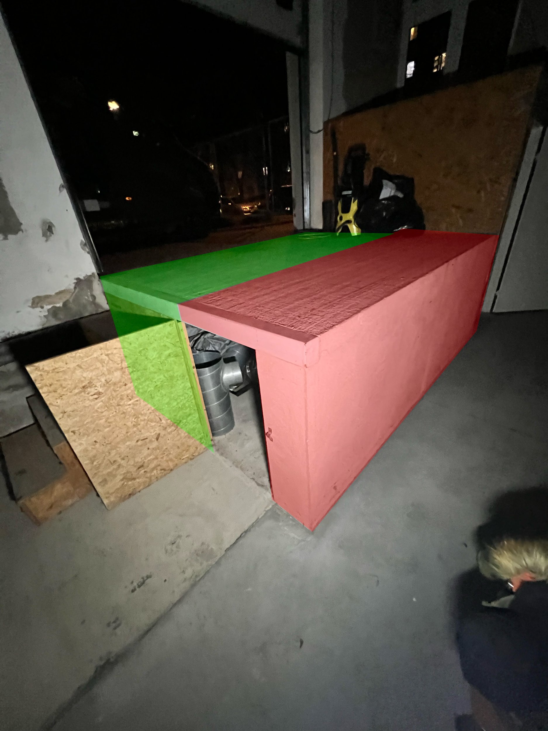Kaubalaadimisplatvormi pikkust oleks vaja vähendada meetri võrra. Pildi peal rohelisega märgitud osa peab jääma ning punane vajab eemaldamist.