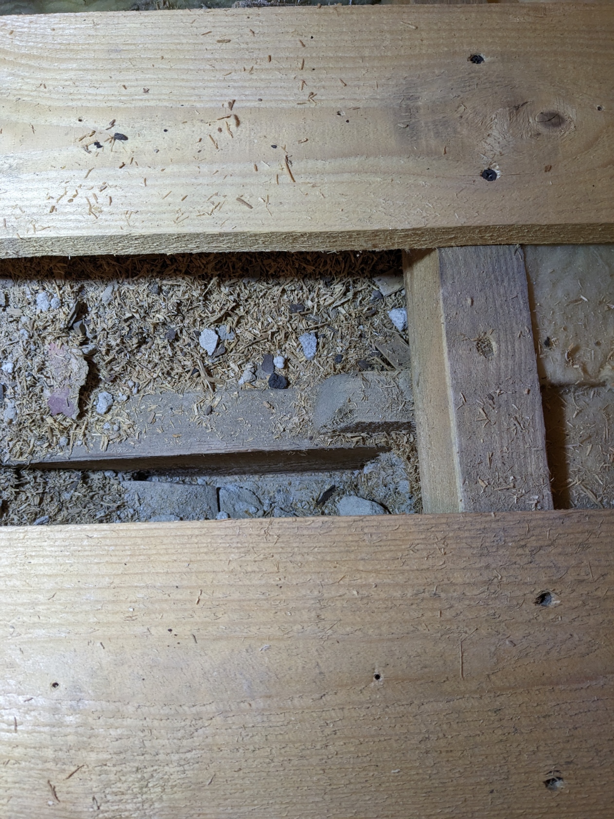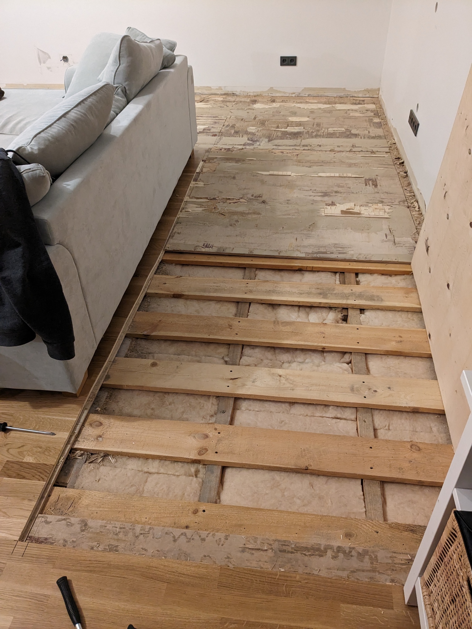 Selle jaoks, et aru saada, milles on probleem võtsime põranda osaliselt lahti. Avastasime, et kandevtalad on 25x5-6 cm (osade kohtade peal topelt), nende peale on paigaldatud ca 5 cm klotsid (ilmselt tasandamiseks), mille peale on kinnitatud risti teised talad, mis on 10x5 cm, nende peal on laudis ning laudise peal vineer, mille peal parkett.