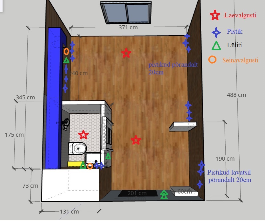6. Elektrijuhtmestik vedada vastavalt pistikute, lülitite, valgustite ja köögi kodumasinate joonisele ning paigaldada valgustid, lülitid, pistikud, nõrkvool ja vannitoa põrandasoojenduse lüliti. Paigaldada elektrikilp.