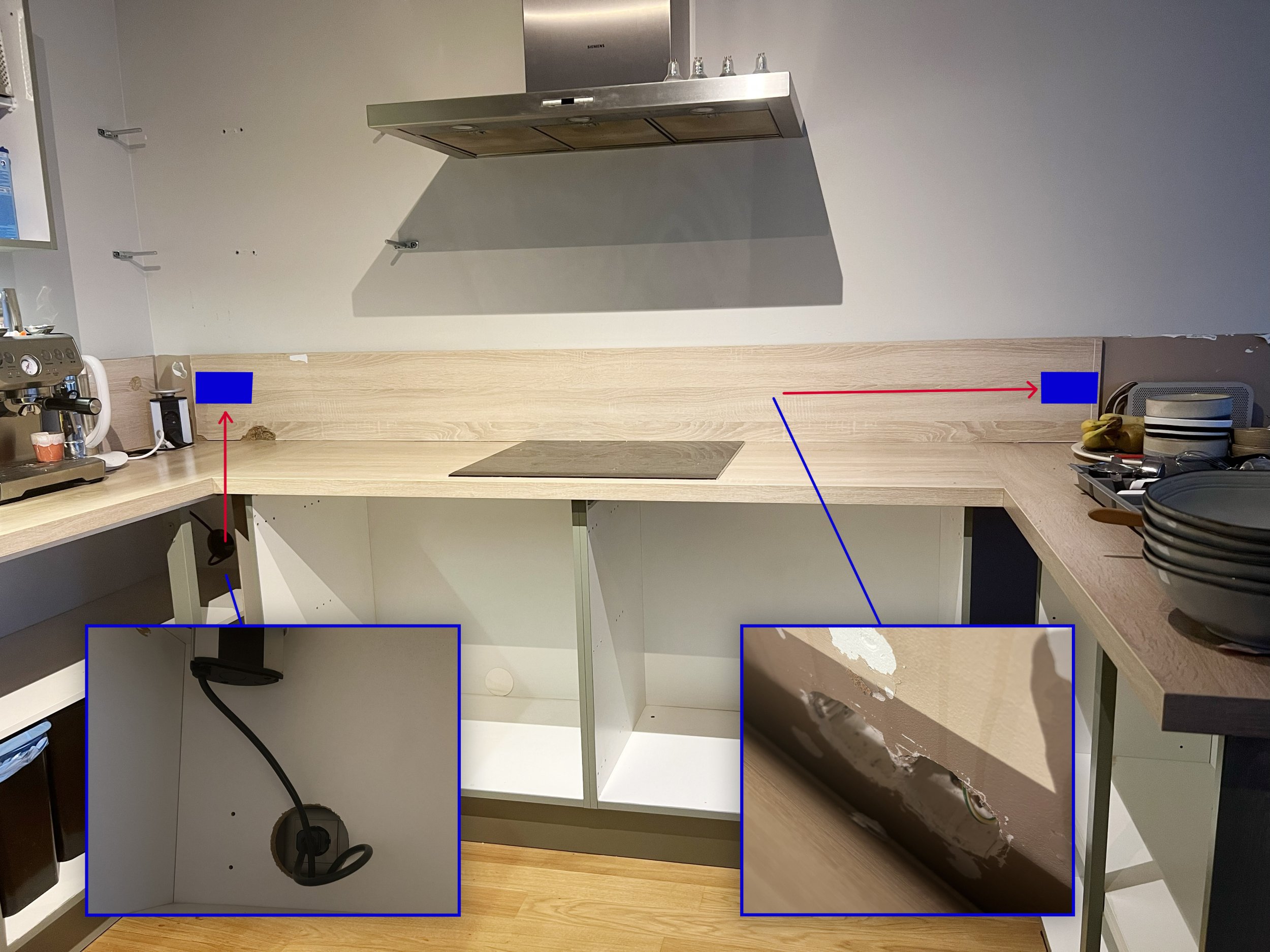 Vahetame köögimööbit ja tahame seetõttu liigutada pistikupesasid. Fotol on näha, mis pesadega on tegu ja kuhu tahaksime liigutada. Palun tehke oma pakkumine sellele projektile. Pistikupesad muretseme ise, aga muu materjal peaks tulema teilt.