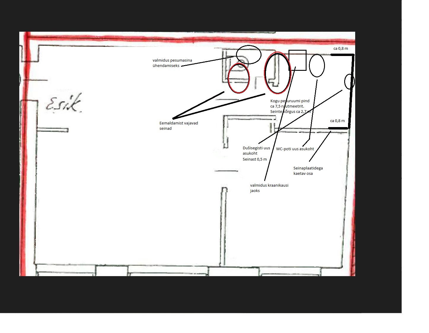 WC-pesemisruum vajab kapitaalremonti. Lisaks allolevale tekstile vaadake palun plaani. PS! Plaan on illustratiivne ja mõõdud on ligilähedased, aga täpsuse huvides tuleb ruum ja seinad üle mõõta, sest mõõdud võivad ca +/- 10 cm erineda.