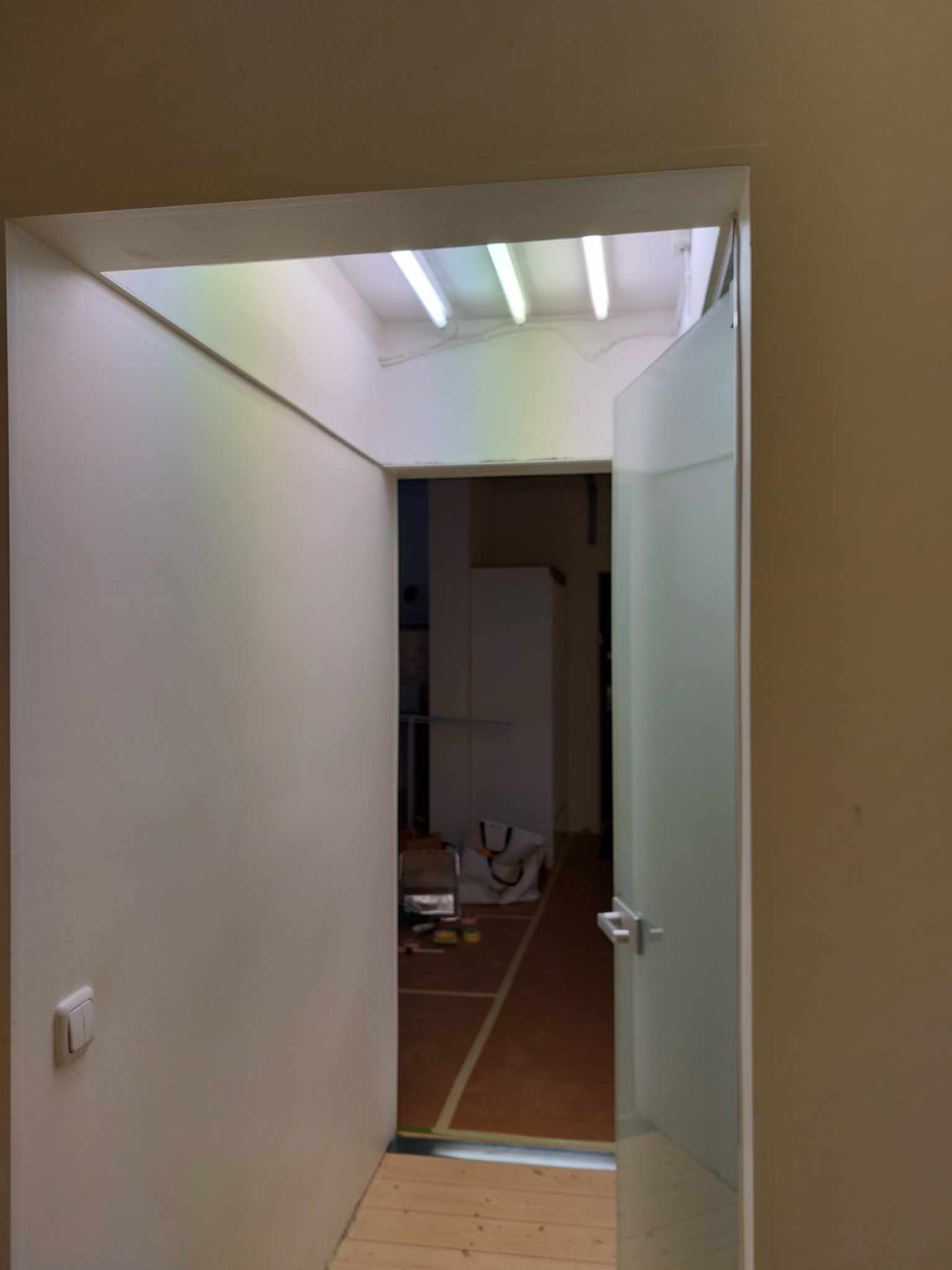 Vaja on lammutada kaks väikest seina, viia kogu ruumi lagi ühele kõrgusele (ca 2,7 m). Plaatida on vaja kogu põrand (põrandaküte on ka vajalik) ja ainult dušinurk, mis puutub kokku veega (soovitatavalt laeni). Ülejäänud ruum on kaetud valge või halli niiskuskindla seinavärviga, mis sobib märgruumi.