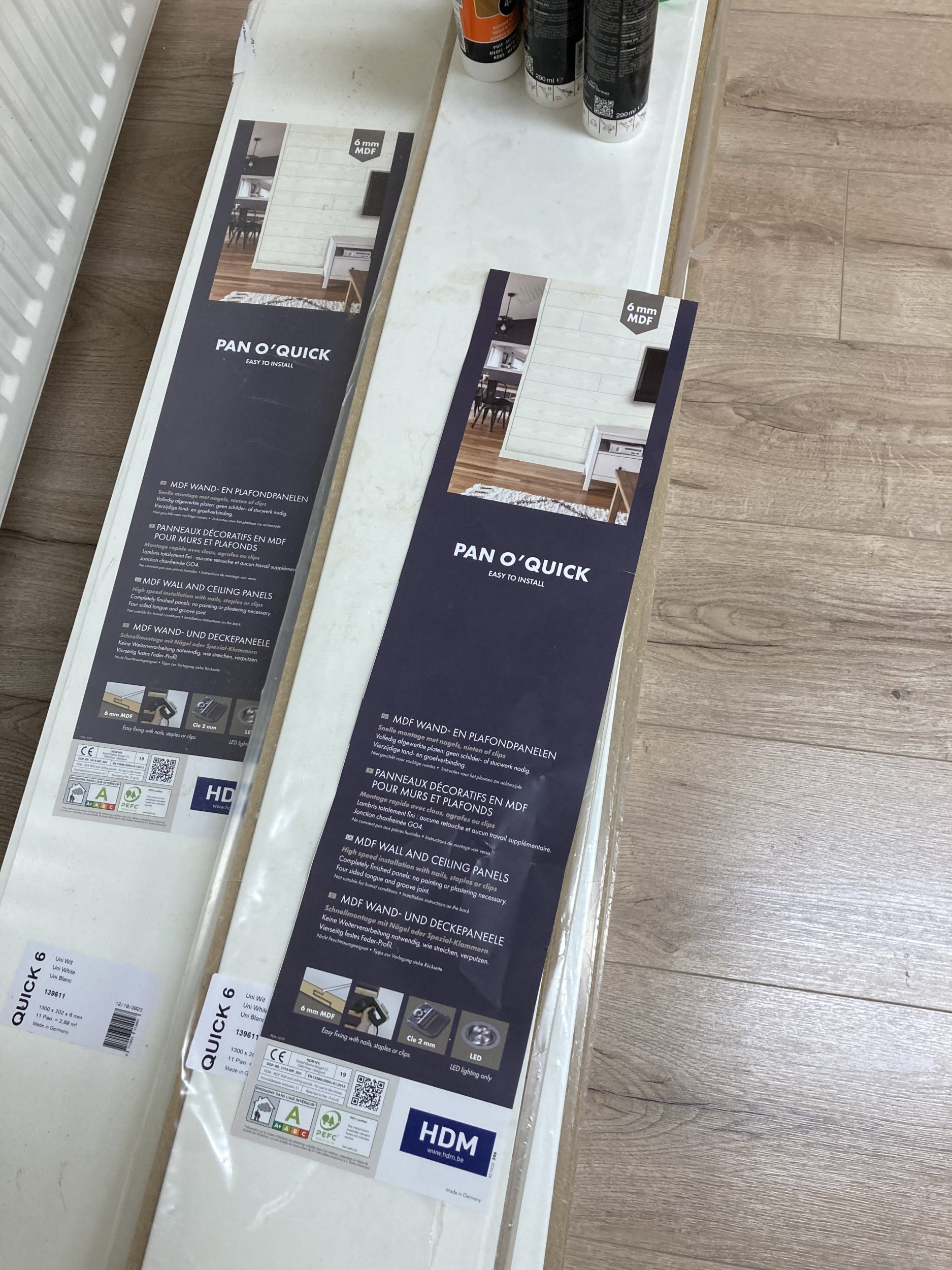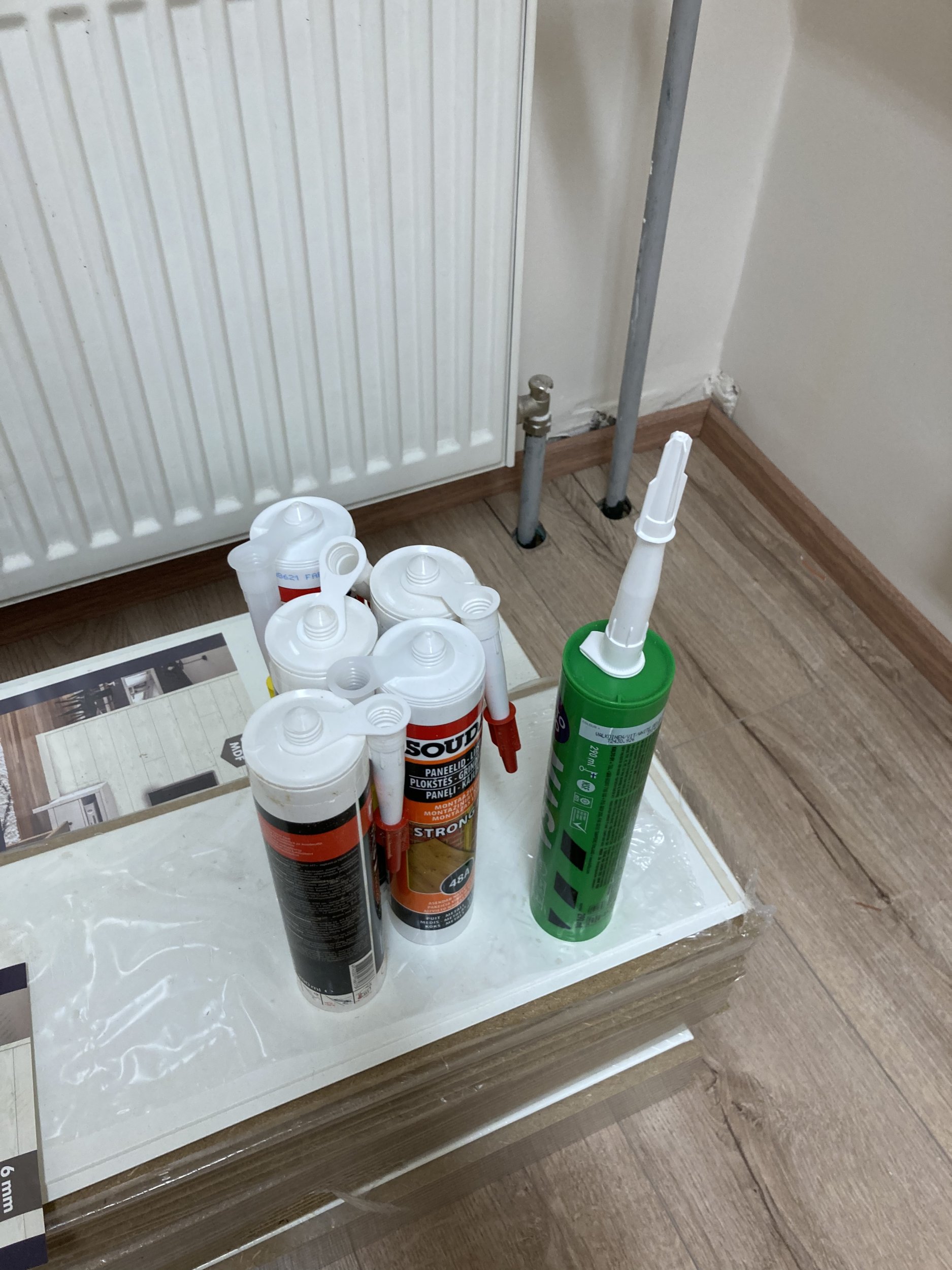 Objektil on olemas piltidel näidatud materjal - MDF 6mm laepaneelid, liimhermeetik, ja sisenurgaliistud. Tellija tagab vajadusel puuduoleva materjali.