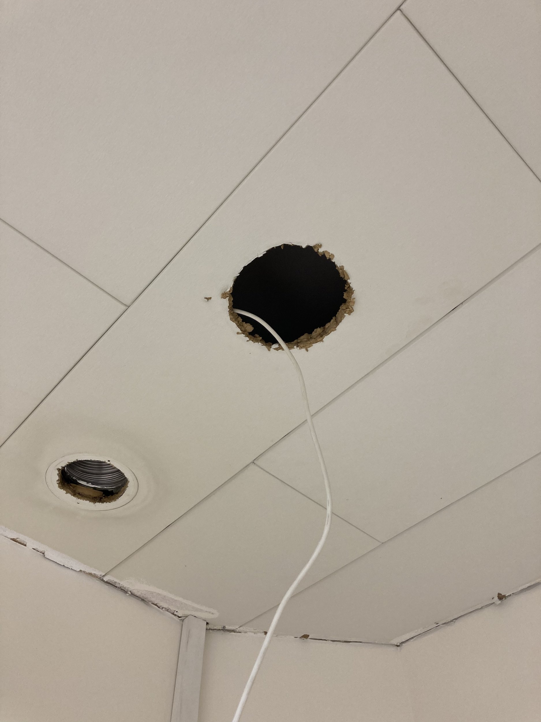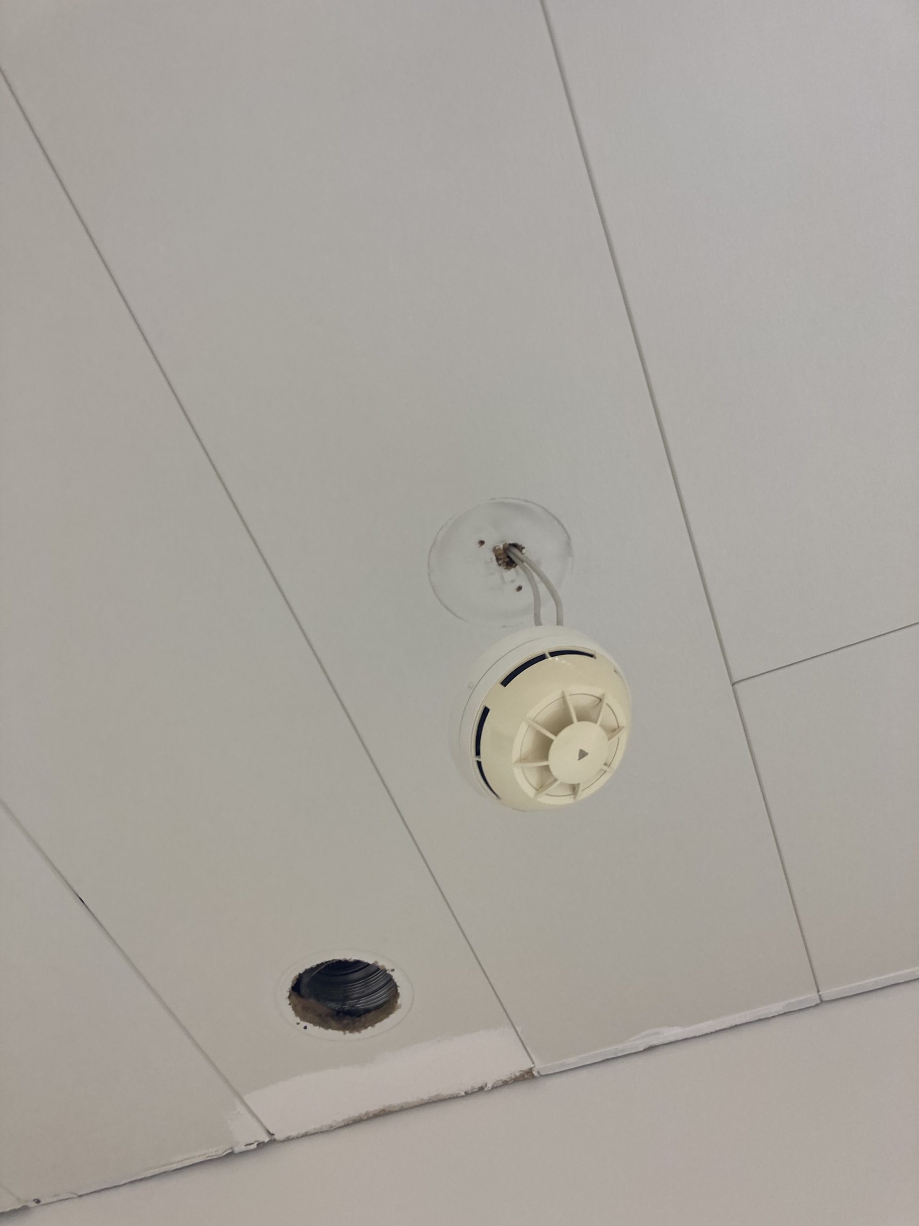 Vaja tekitada läbiviik kahele ventilatsiooniavale, kõlarile ja suitsuandurile. Laes on ka kaks pinnapealset valgustit. Kõik seadmed töövõtja poolt tagasi installeerida. Servadesse paigaldada sisenurgaliist ja vajadusel ebatasasused hermeetikuga katta ( Kiilto MASA olemas). Seinad lainetavad.