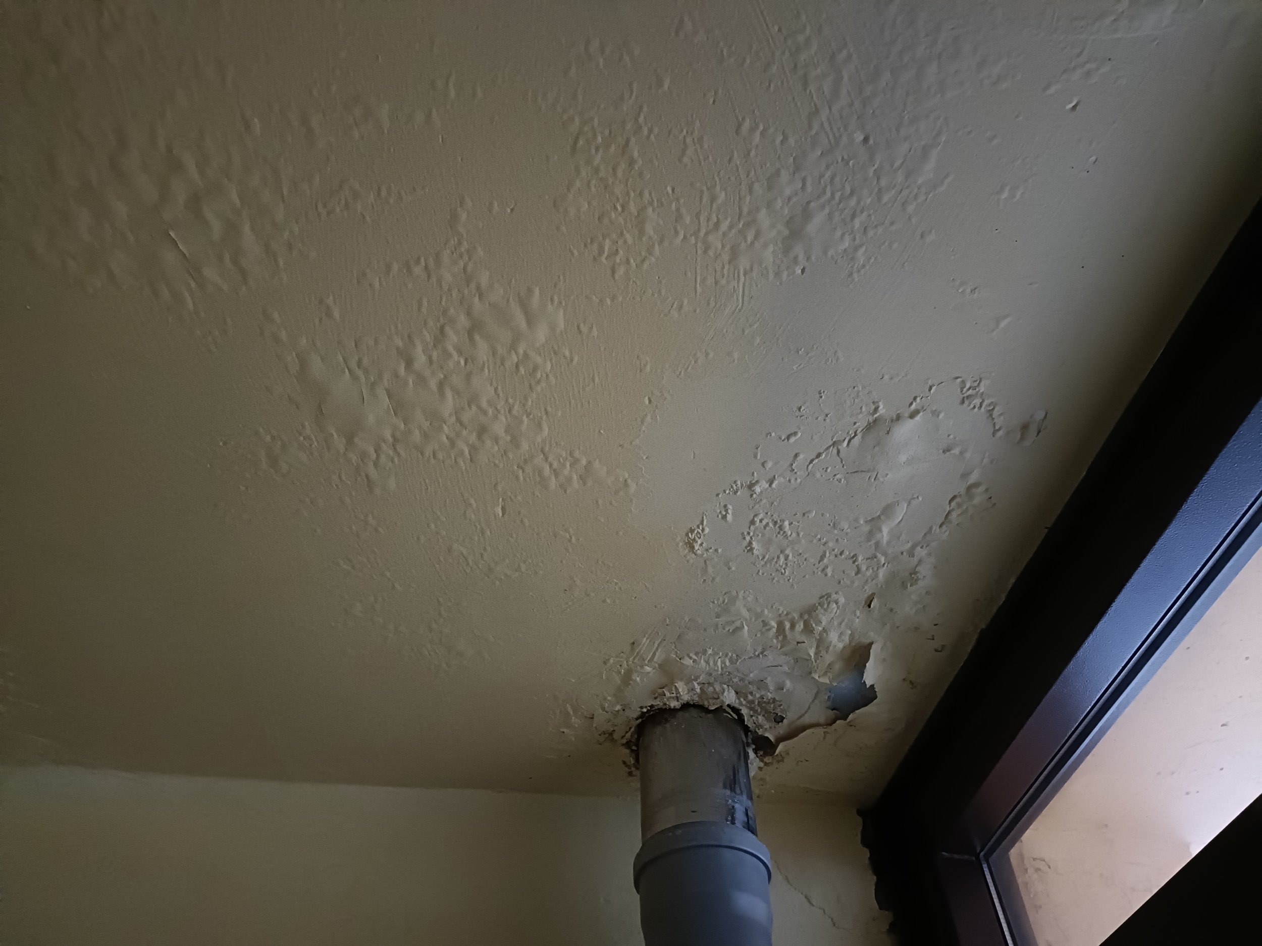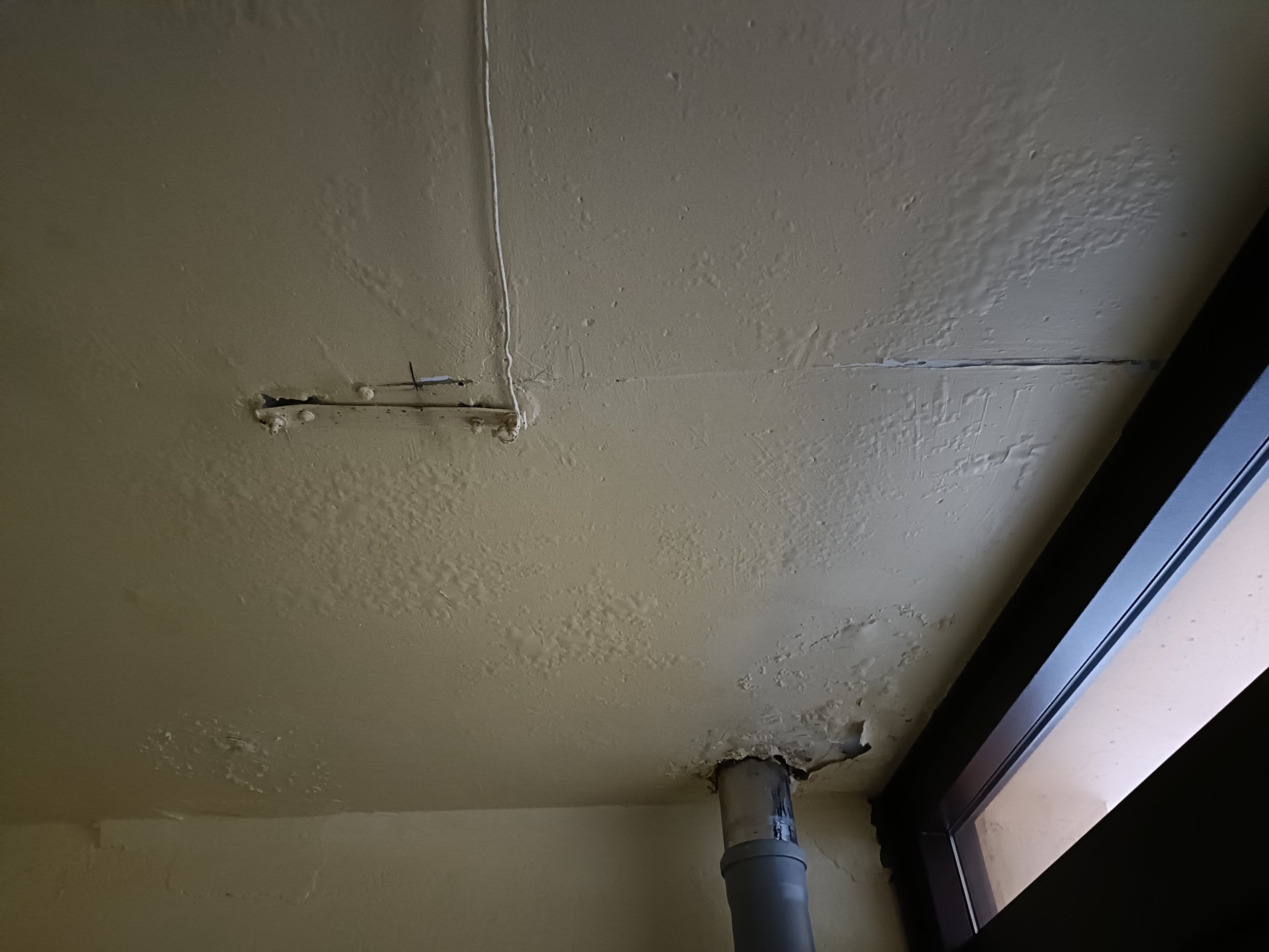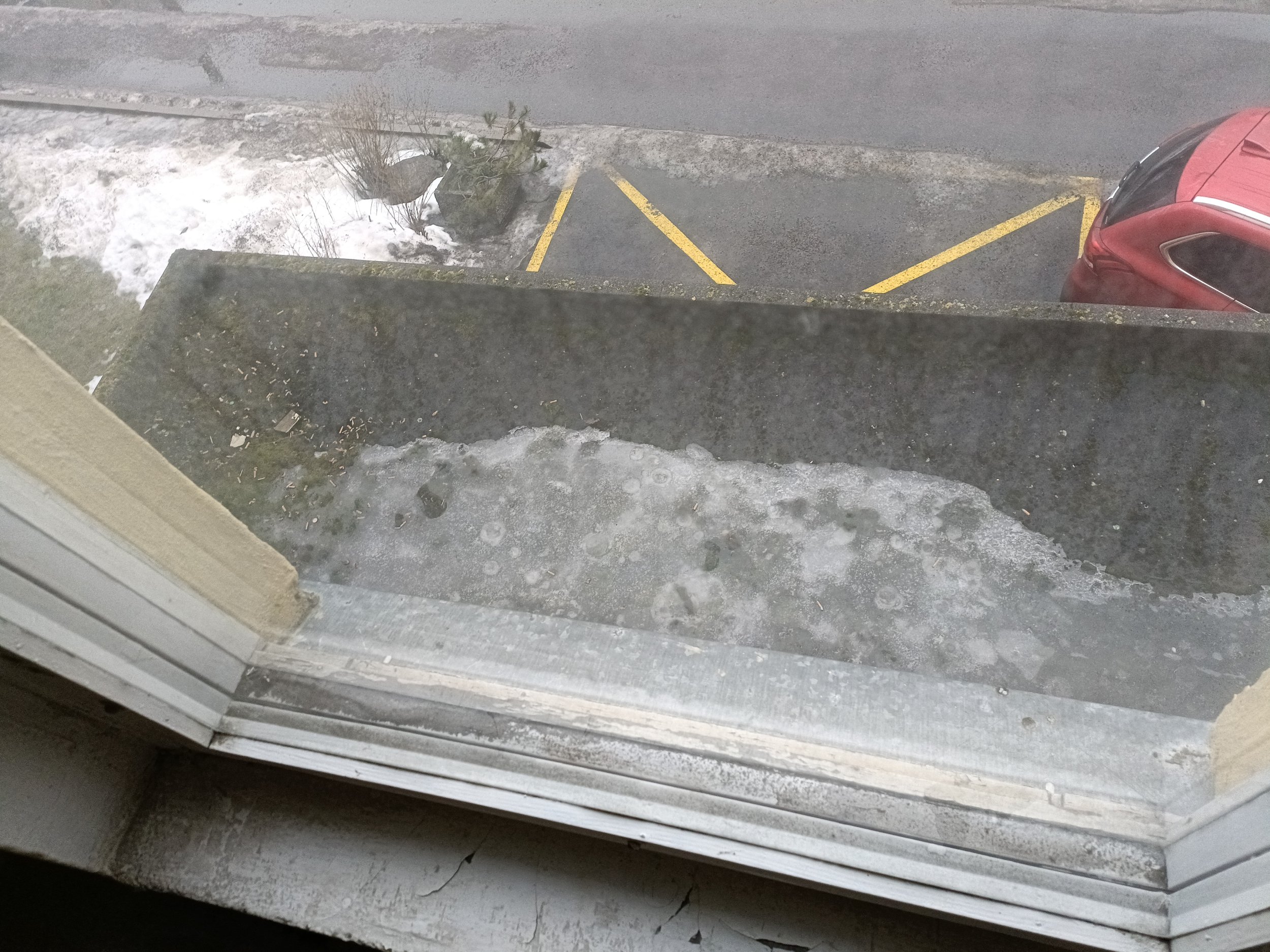 Üheksakorruselise maja eeskoja varikatuse puhastamine, sadeveetoru hermetiseerimine.