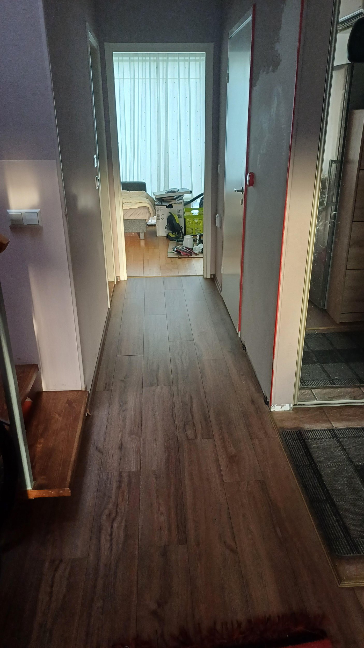 Veekahjustuse saanud katuseakna ava kinni ehitamine nii seest, kui väljastpoolt veetihedaks tegemine, kahjustunud kipsi vahetus, trepihalli seintele kattematerjali paigaldus, tasandamine, värvimine, vinüülparketi paigaldus 45m2, koridori seinte pahteldus ja värvimine, ( ca 10m2) puidust uued trepikäsipuud, pikipiirded. Asukoht Muuga alguses (Altmetsa)