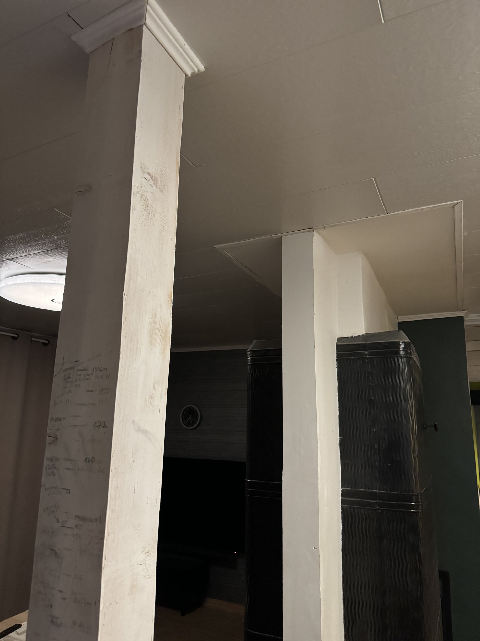 Esimesel korrusel plaanis vahetada ahi kamina vastu. Selle käigus vaja lisatoestus laele. Lisatud pildil värvitud kiviseina eemaldamine ja asendamine toetusega.