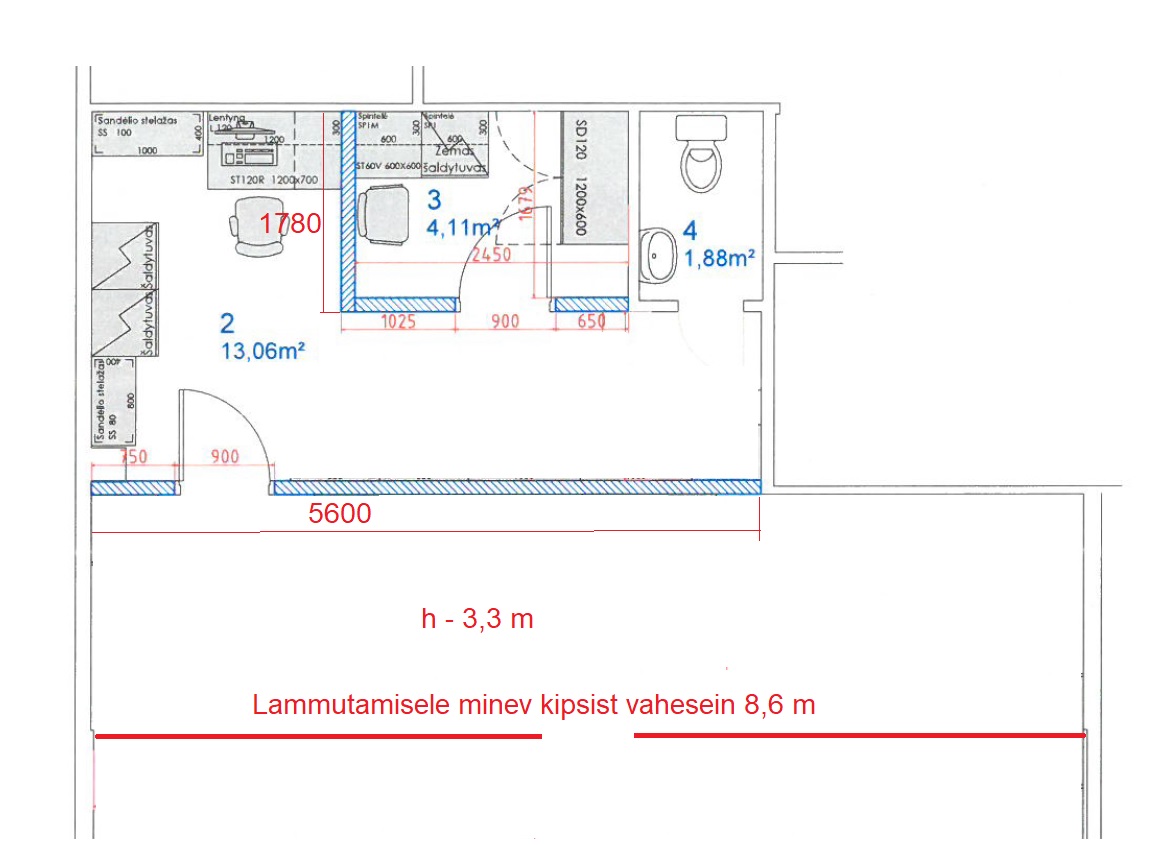 Vaja lammutada ja utiliseerida 8,6 m kipsist vahesein (joonisel märgitud punasega) ja ehitada 5,6 m ukseavaga sein, 2,58 m ukseavaga sein j a 1,78 m sein (joonisel märgitud sinisega) Paigaldada 2 valget sileust. Maalritööd 90 m2