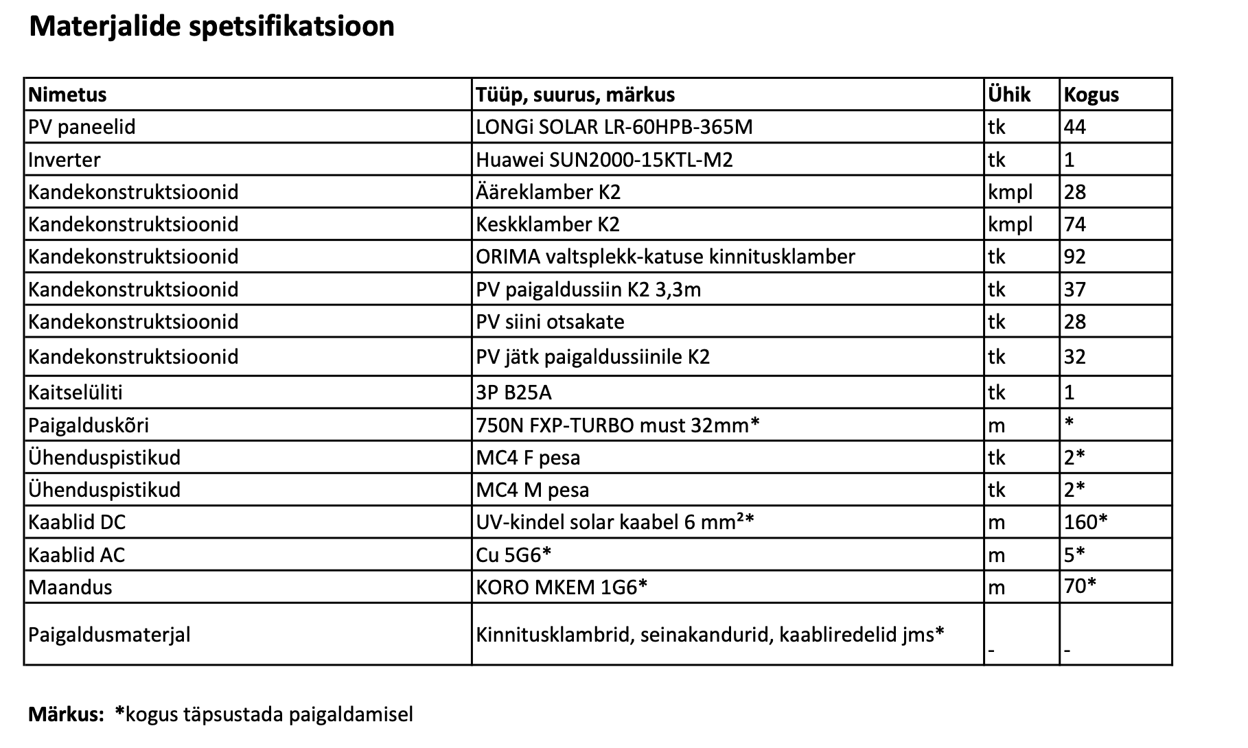 1) olemasoleva päiksepargi laiendus 16 paneeli 2) lisanduv Froniuse inverteri + paigaldus 3) olemasoleva inverteri asukoha muudatus + paneelide kaabelduse pikendamine 4) kahe inverteriga + smart meter süsteemi planeerimine ja teostus Pakutavad seadmed: 1. Q.PEAK DUO BLK M-G11A+ 400W üleni mustad paneelid; 2. Fronius Symo GEN24 Plus 10 kW hübriidinverter Tööde lõplikuks kinnitamiseks soovime objekti tulla enne üle vaatama, et veenduda kõikides detailides ja võimalustes. Tööde teostamiseks soovime sõlmida ka lepingu. |