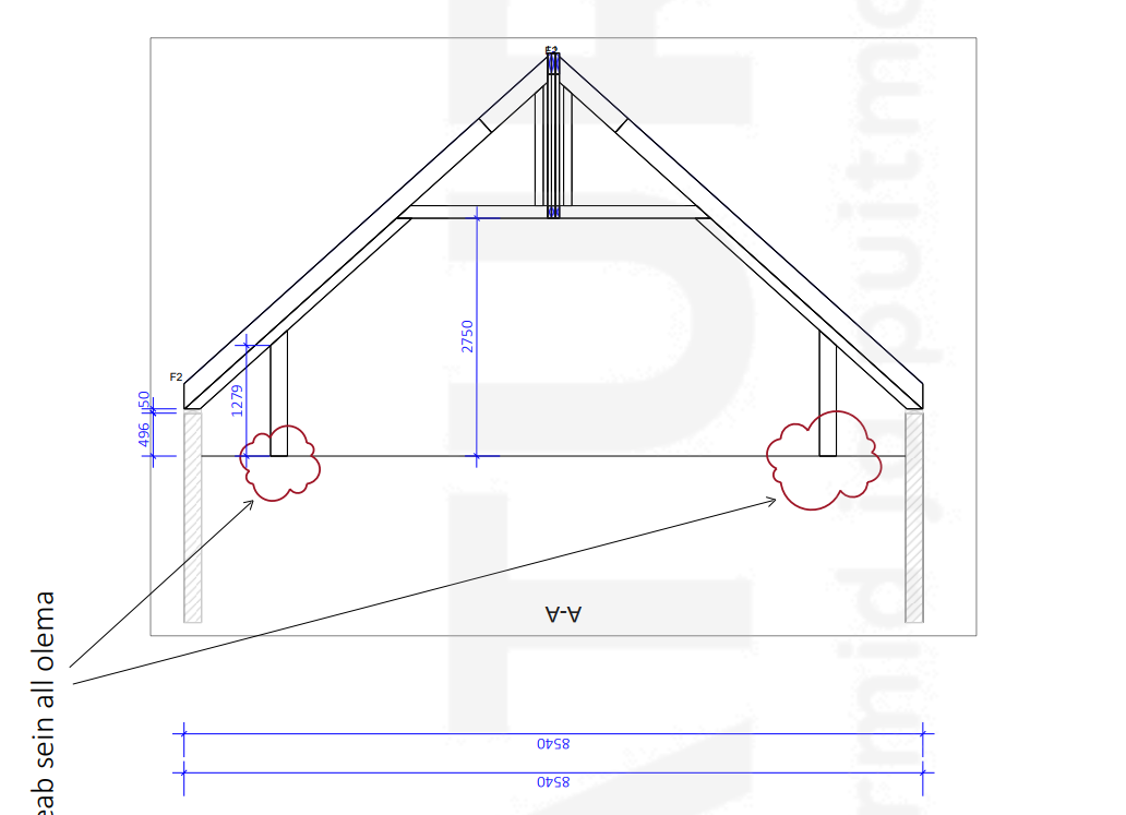* Fermide paigaldus müürivööle (puitkarkassile) ja vahelaevööle. Fermid tellib tellija (ilma tõsteta), sarnased nagu kaasasolevatel joonistel. Eelnevalt lepitakse tööde teostajaga kokku tugipostide täpne kõrgus. Tarnitakse kahes osas, vajalik objektil kokku monteerimine. Paigaldus enamjaolt 600mm sammuga, korstna ja katuseakende juures ilmselt laiemalt. Eeldatavalt 21 fermi. Vajalik ka 2 nn vahelaevöö paigaldamine tugipostide alla (ca 45*195mm prussid, ca 28m).