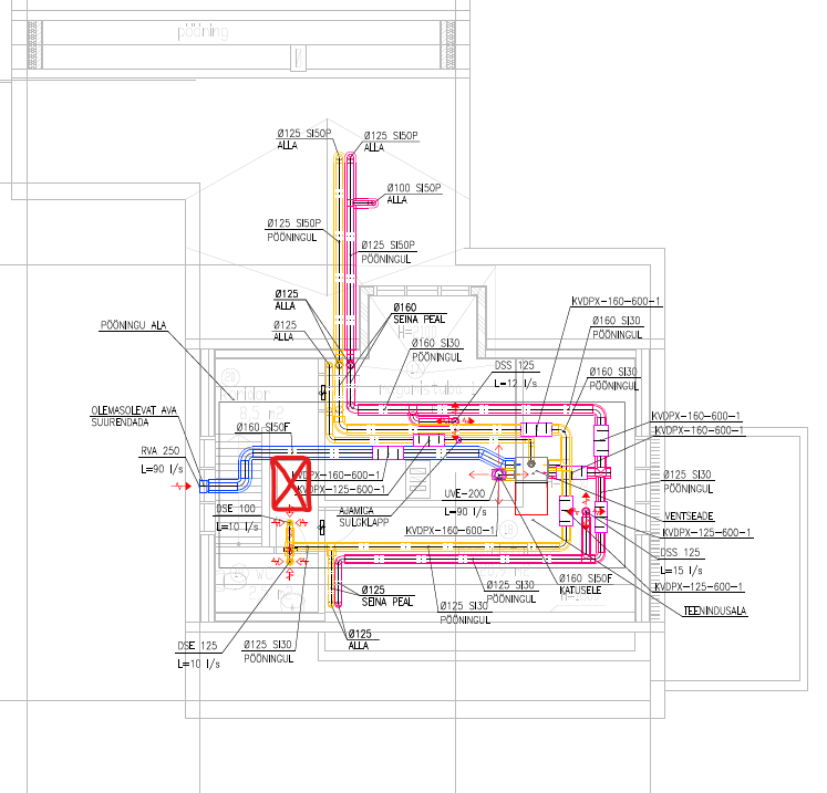 Pööningu ligipääsu asukoha muutumise tõttu ventilatsiooni agregaadi soovituslik asukoht oleks nüüd erinevalt projekti joonistest teisel pool korstent. Uus soovitud asukoht on märgitud ühele pildile.