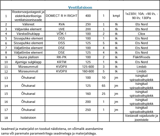 Hankele lisatud pildina projekti järgne ventilatsiooni materjalide nimekiri, joonised (ka kütteprojekti osa - selle välja ehitamine tuleb eraldi hankena) ja projekeerija soovitusliku ventilatsiooniseadme info.