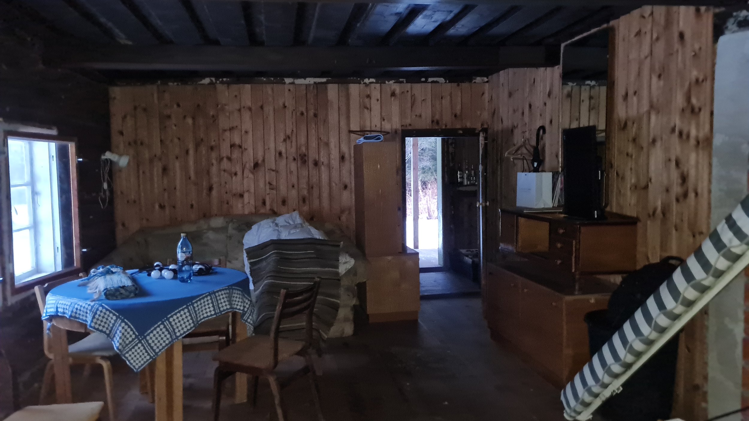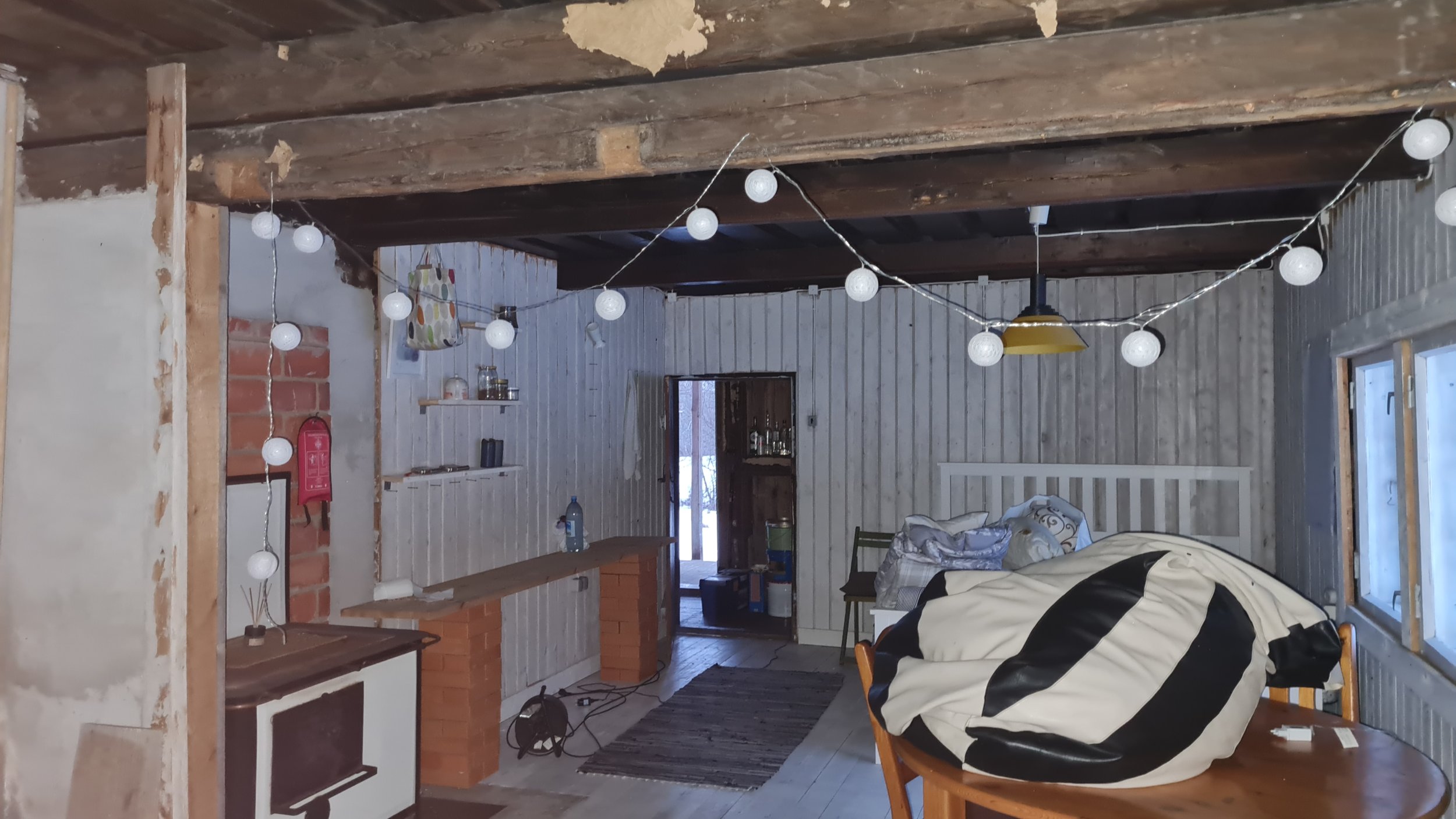 Vana maja seintelt sisemise voodrilaua eemaldus ja ladustamine hoovis.