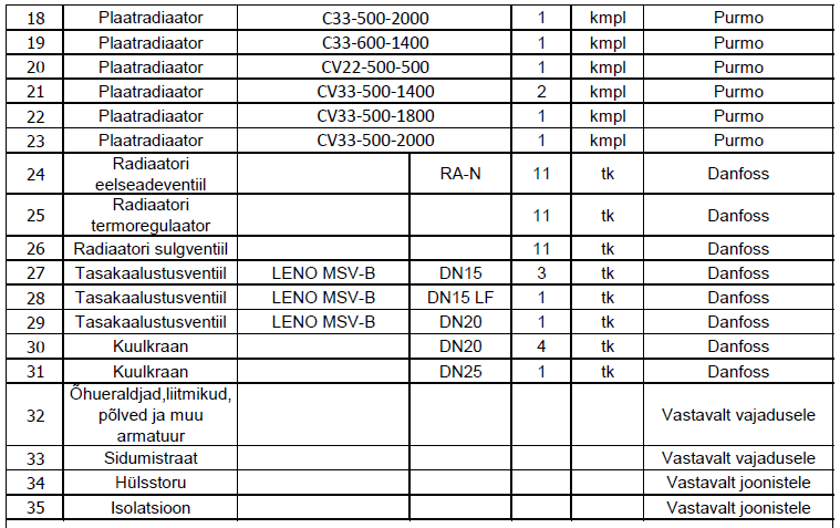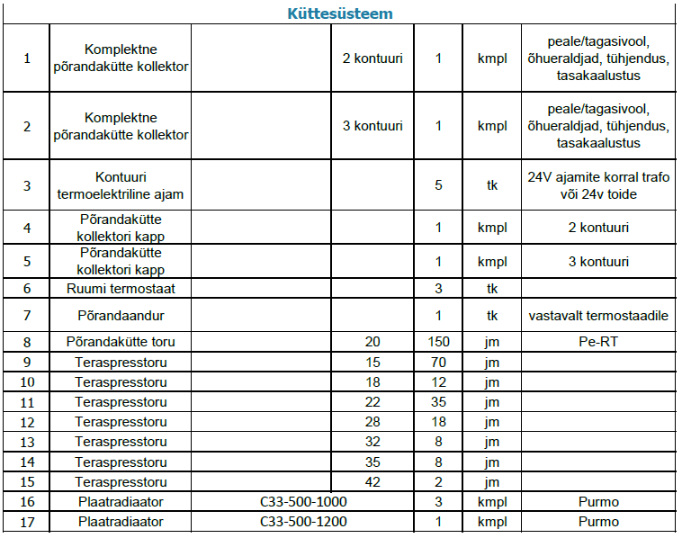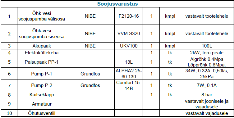 Lisatud projekteerija spetsifikatsioon, kus on toodud näitlikud soojusvarustuse seadmed ja küttesüsteemi osised.