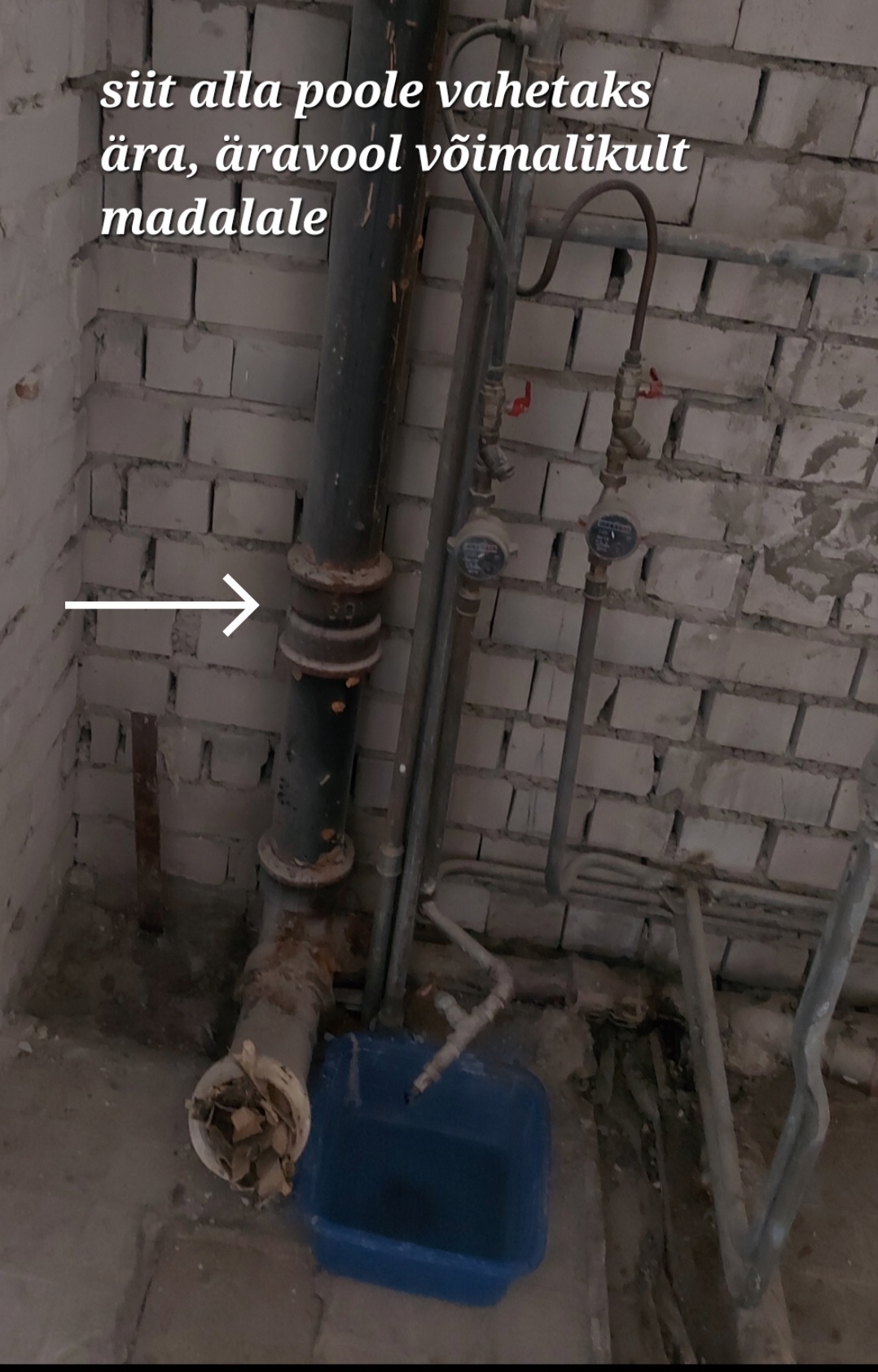Kanalisatsiooni püstiku vahetus: vana kanalisatsioonitoru eemaldus, liitekohtade lahtiühendus, uue toru paigaldus, kolmiku paigaldus, klambritega toru kinnitus. Materjalid ehitaja poolt.