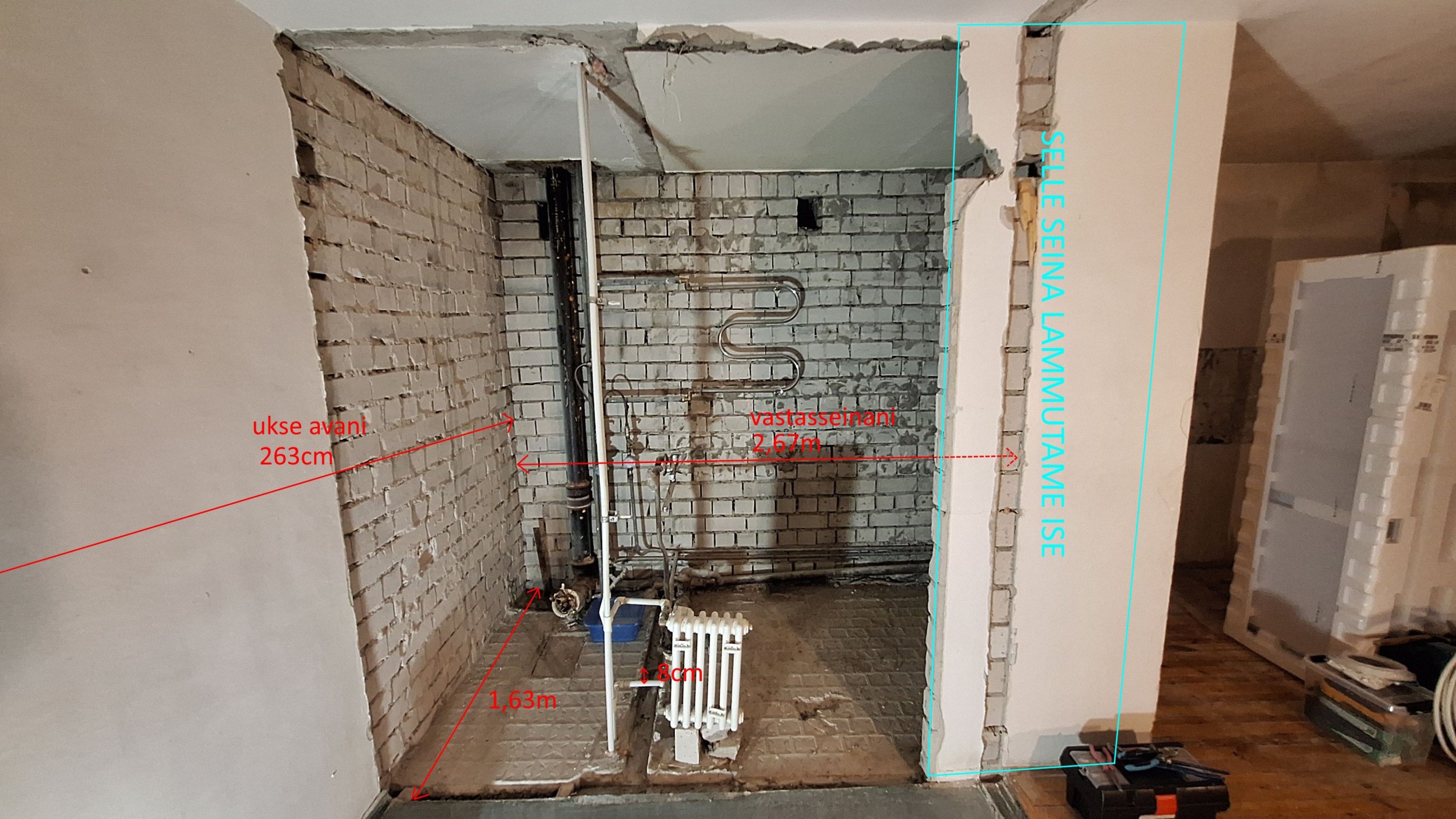 Vana vannituba on tühjaks lõhutud, uus tuleb esiku arvelt suurem (vt fotolt). Uue vannitoa mõõdud: laius: 267cm, sügavus: 263cm. WC ja vannituba tulevad eraldi, palun vaadake kaasa pandud joonist.