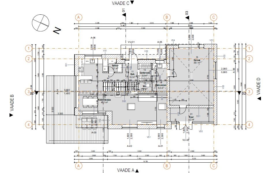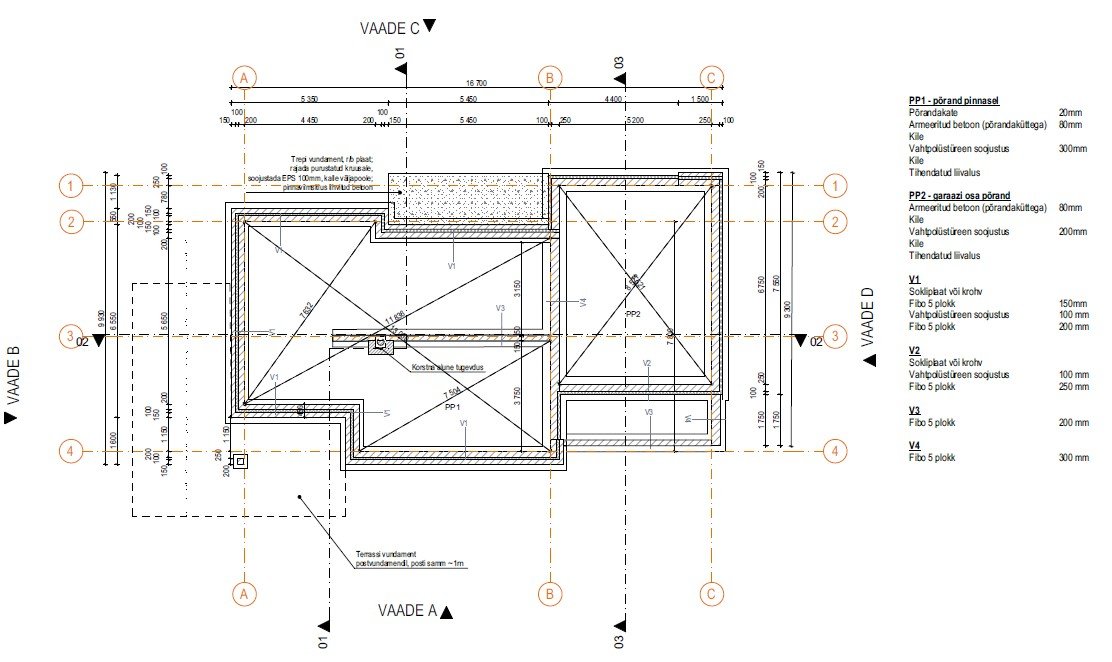Välisseinad elumajal Bauroc 500, garaazil 375, õõnespaneel rb vahelagi, kivikatus. Maja ees sissepääsusüvend ja maja taga nurgas terrassisüvend/sopistus.