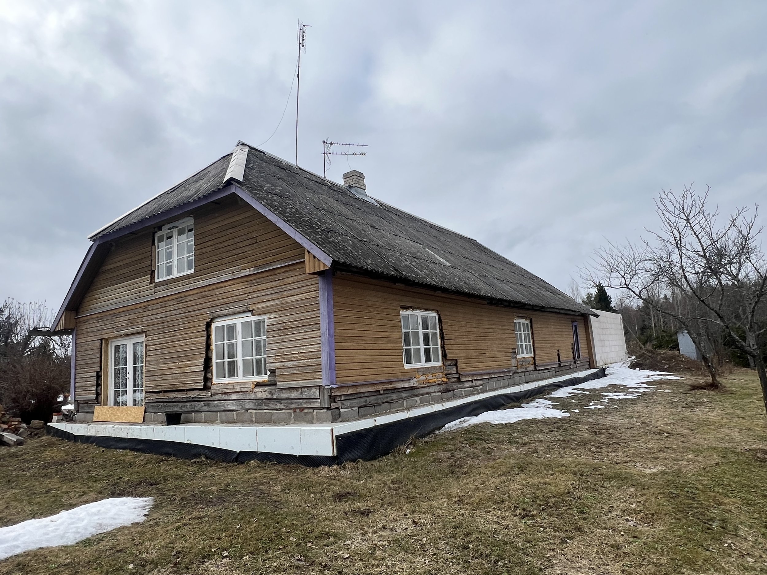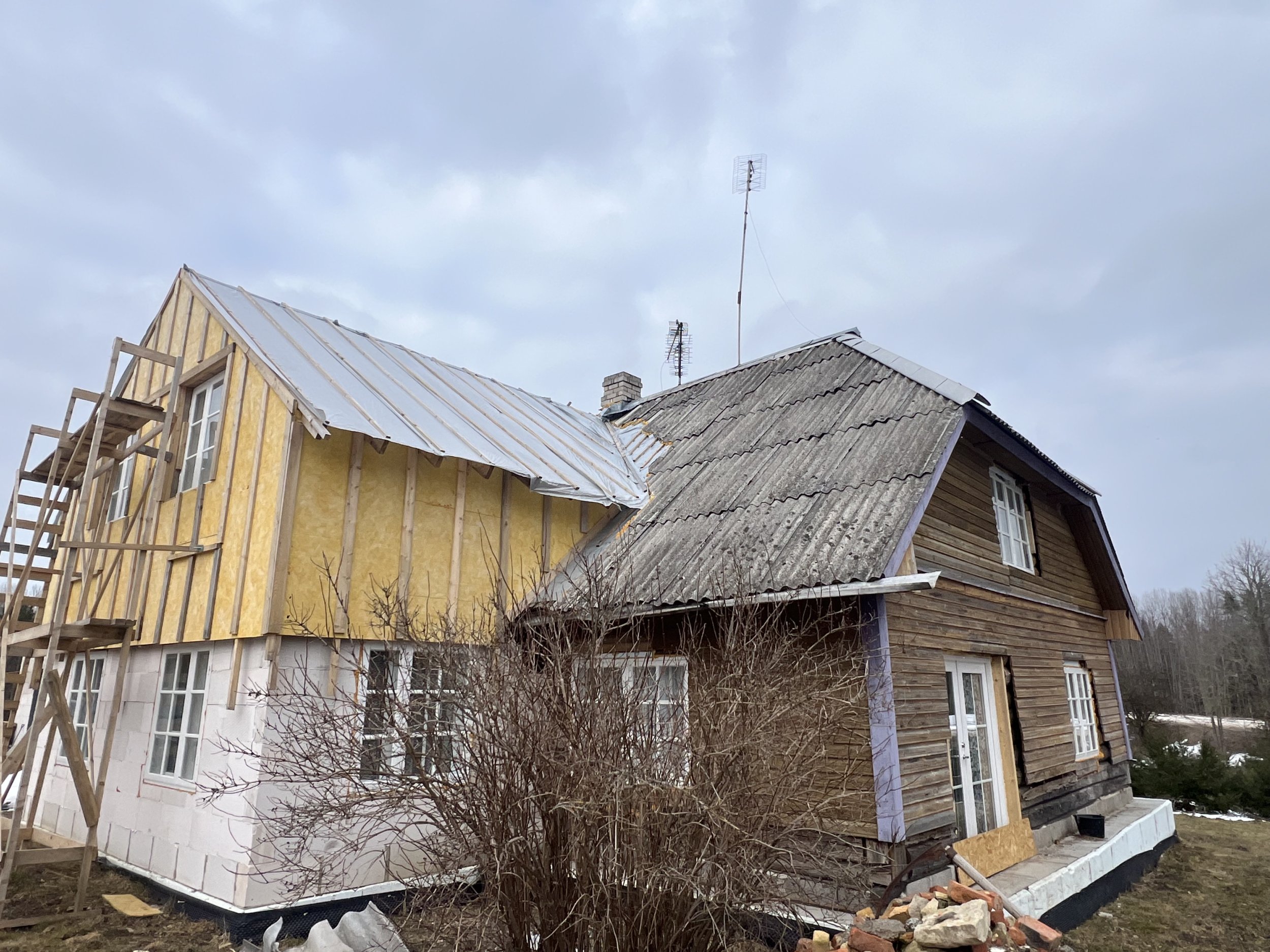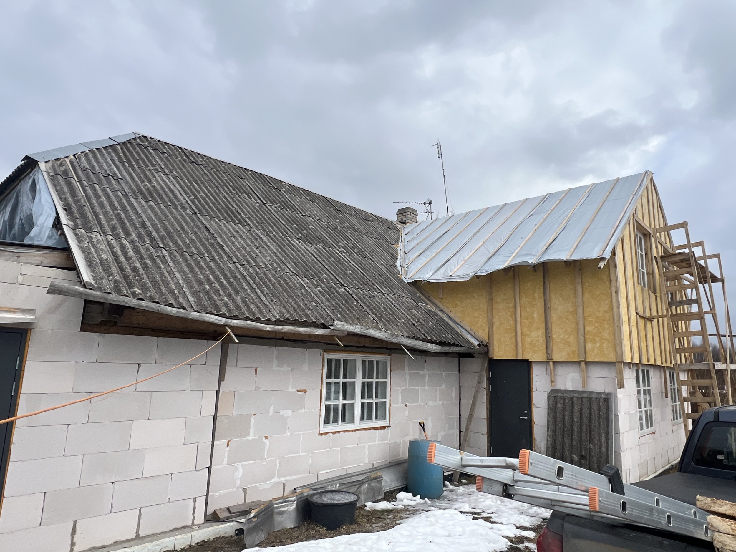 Eterniitkatuse vahetus plekkatuse vastu. Maja vanal osal ( ca 200m2) eemaldada tuleb eterniit, laastukatus ja ümar roovitus. Lisada sarikaid, roovitus. ja katuseplekk. Maja uuel osal (ca50m2) roovitus+plekkkatus. Tuulekastide ehitus. Vanale osale tuleb 3 katuseakent, mõõdud selguvad.