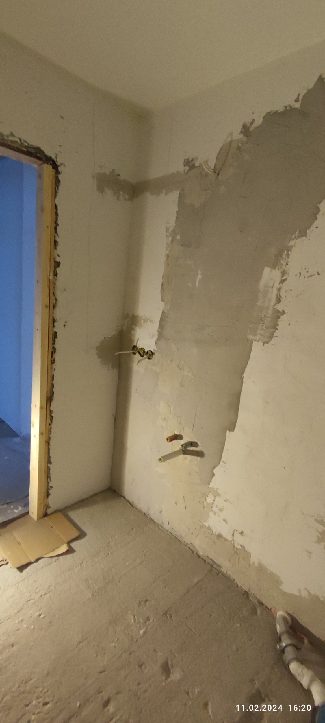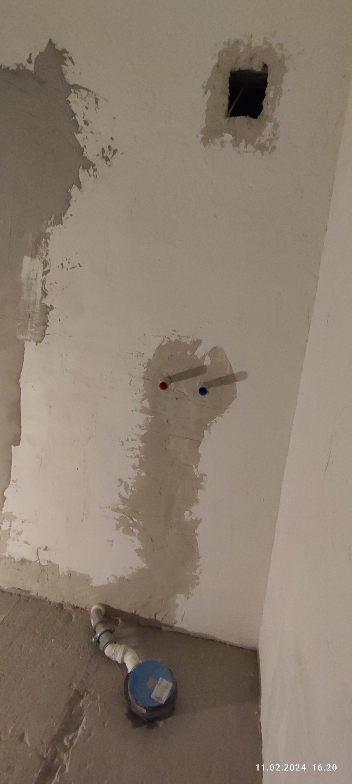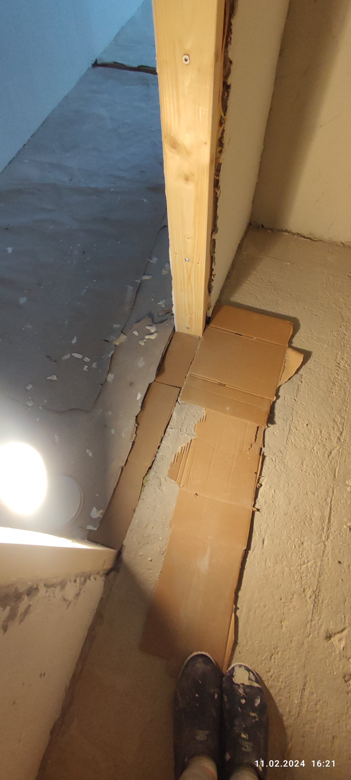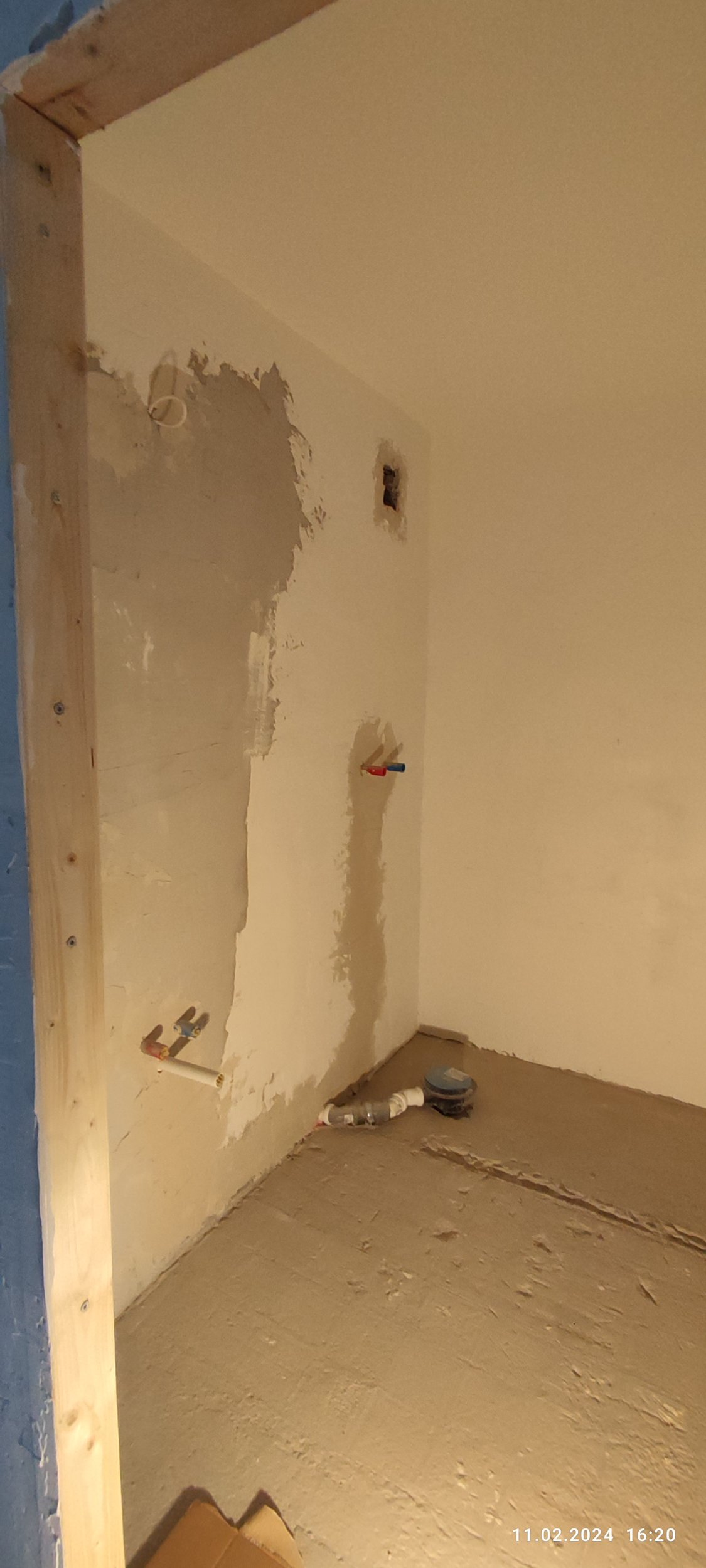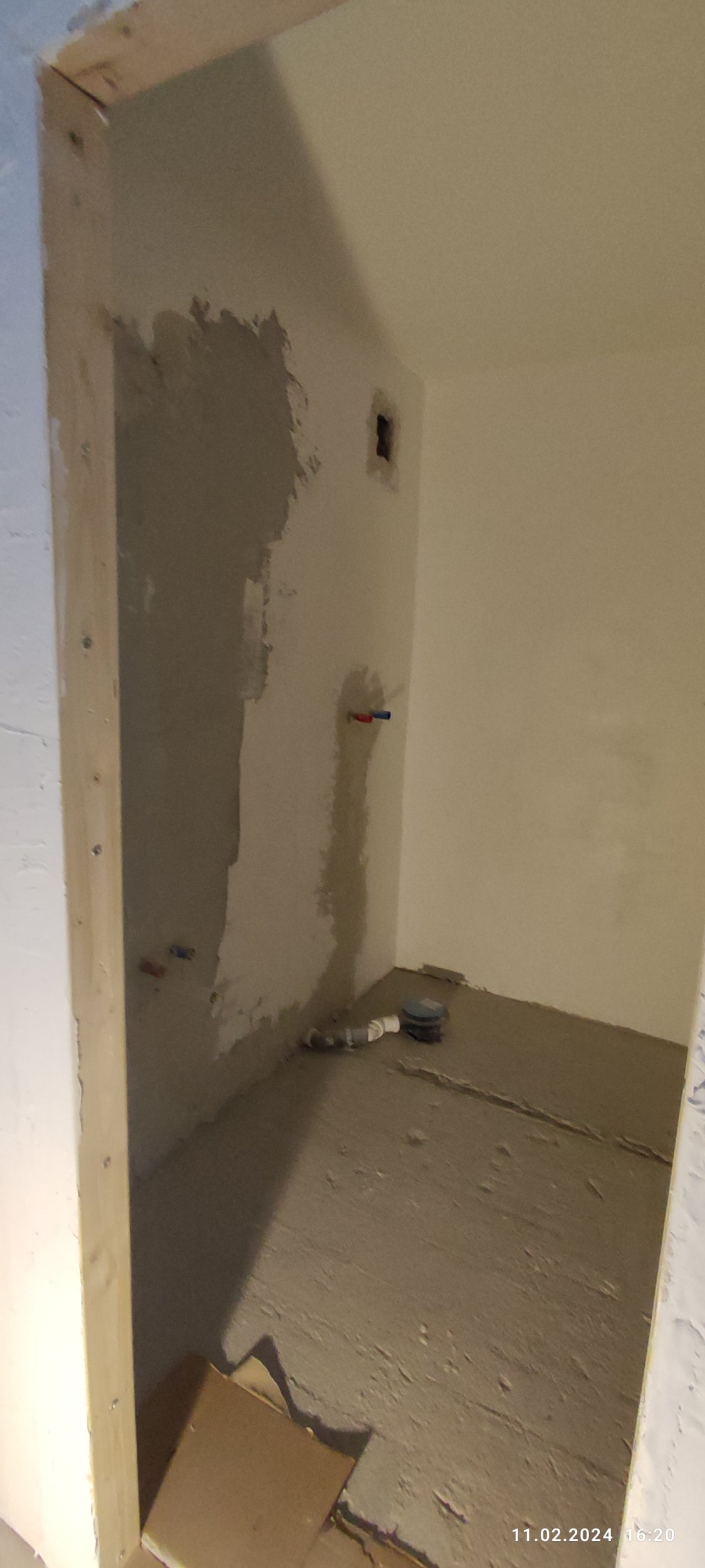vannitoa aluspõrand vaja saada õigele kõrgusele, et pärast plaatimist jääks esiku põrandaga ühele kõrgusele. Ehitada dušinurk astmega põrandal kuhu hiljem tuleb peale dušiseinad ja uks, kuna äravoolutoru põrandast kõrgemal. Seina ja põranda hüdroisolatsioon + plaatimine. 2 seina plaatida, vuukimine jmv. 2 seina pahteldada ja värvida.