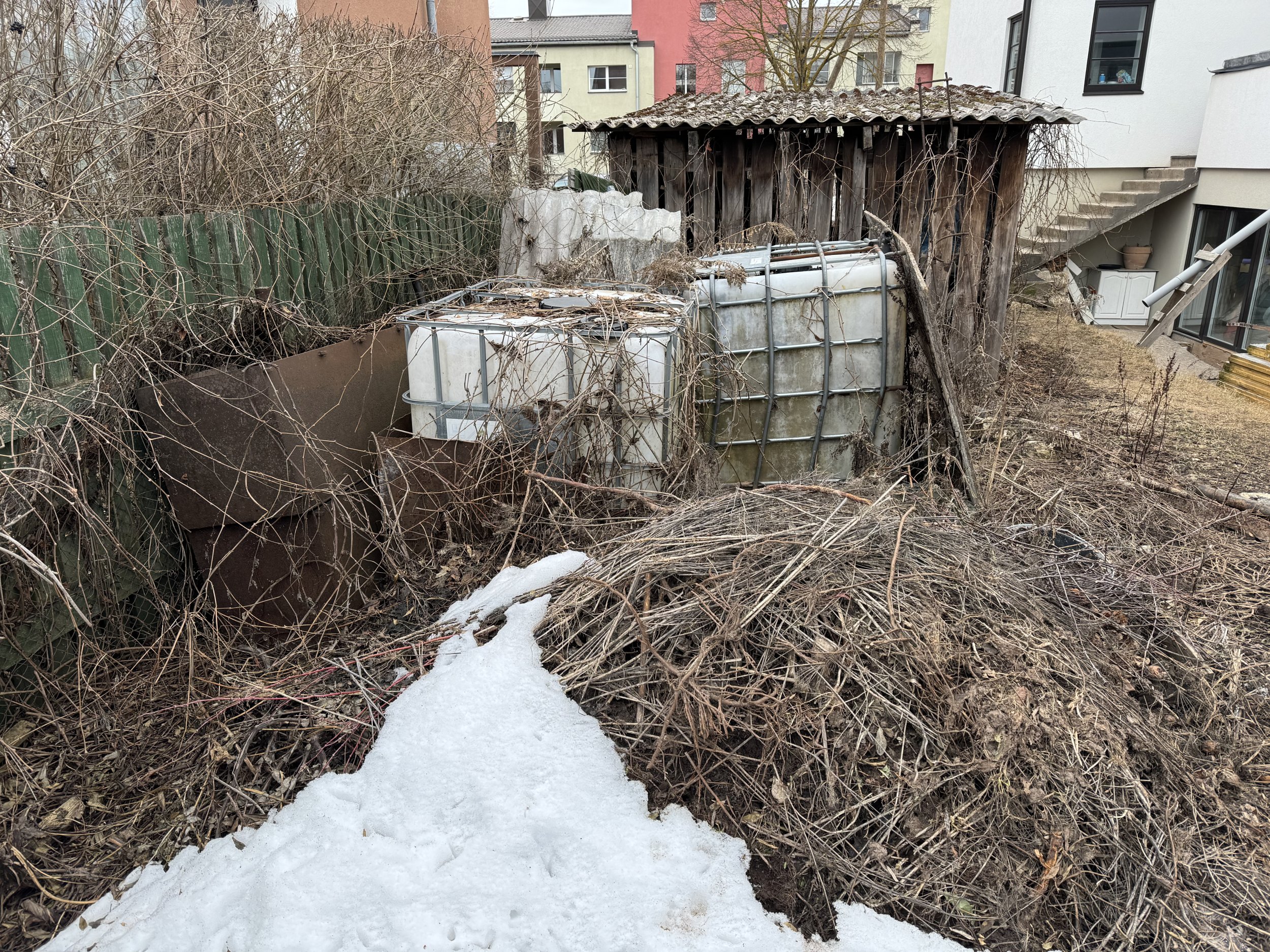 Tagumine hunnik, kus on paar suuremat metallist "vanni" ja IBC mahutit, ei ole auto/käruga ligipääsetav. Vahemaa ca 20m.
