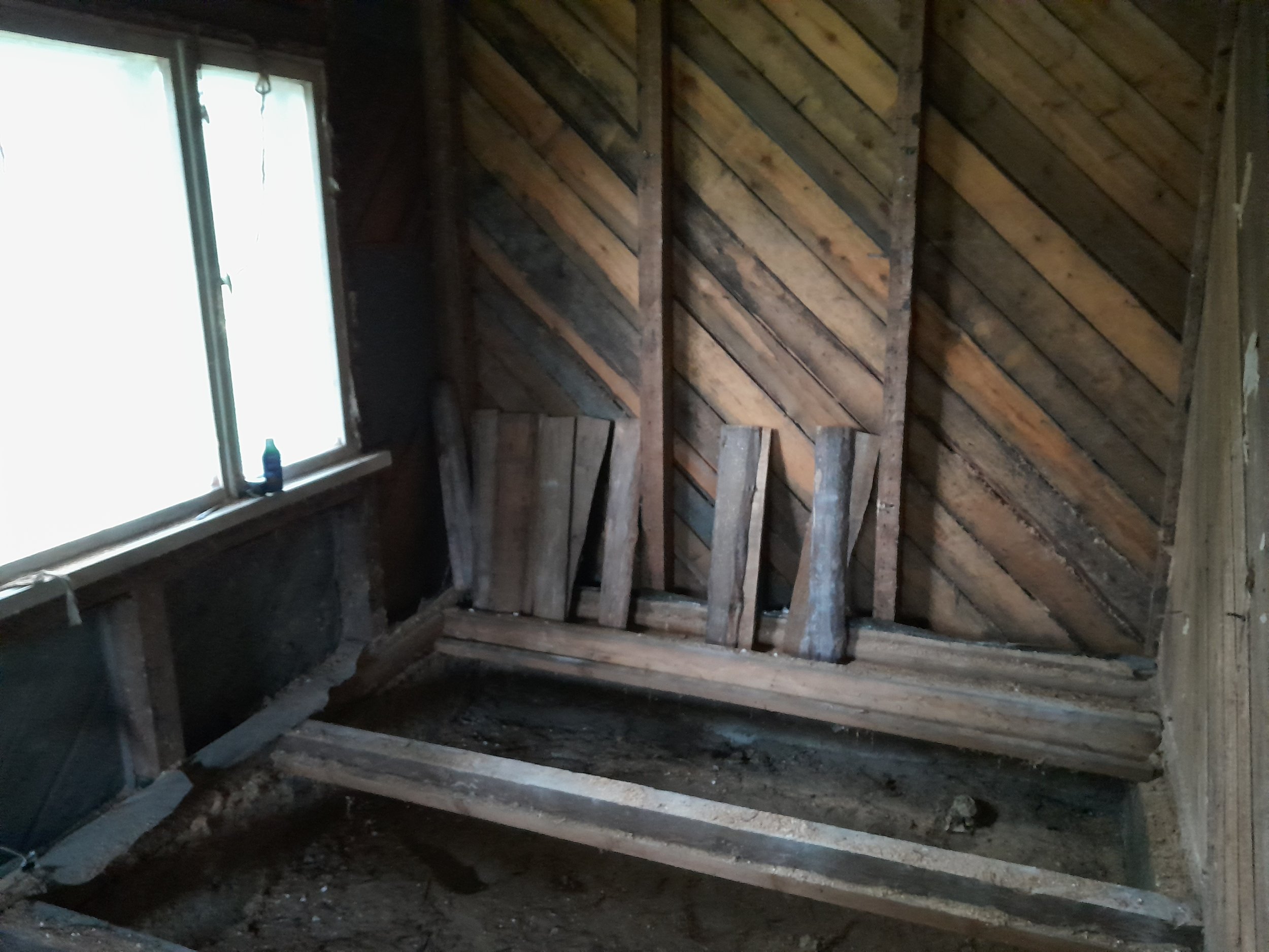 2. Esiku põrand lammutada (puittalad, 4 cm tapiga põrandalaud, vineer, 10 cm saepuru ja must laudis) ja valmistada ette - 7,2 m2