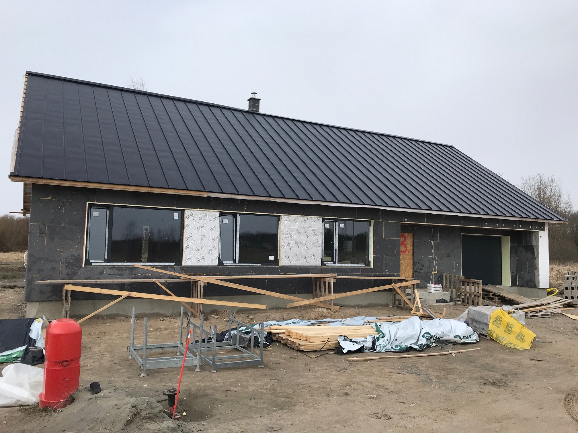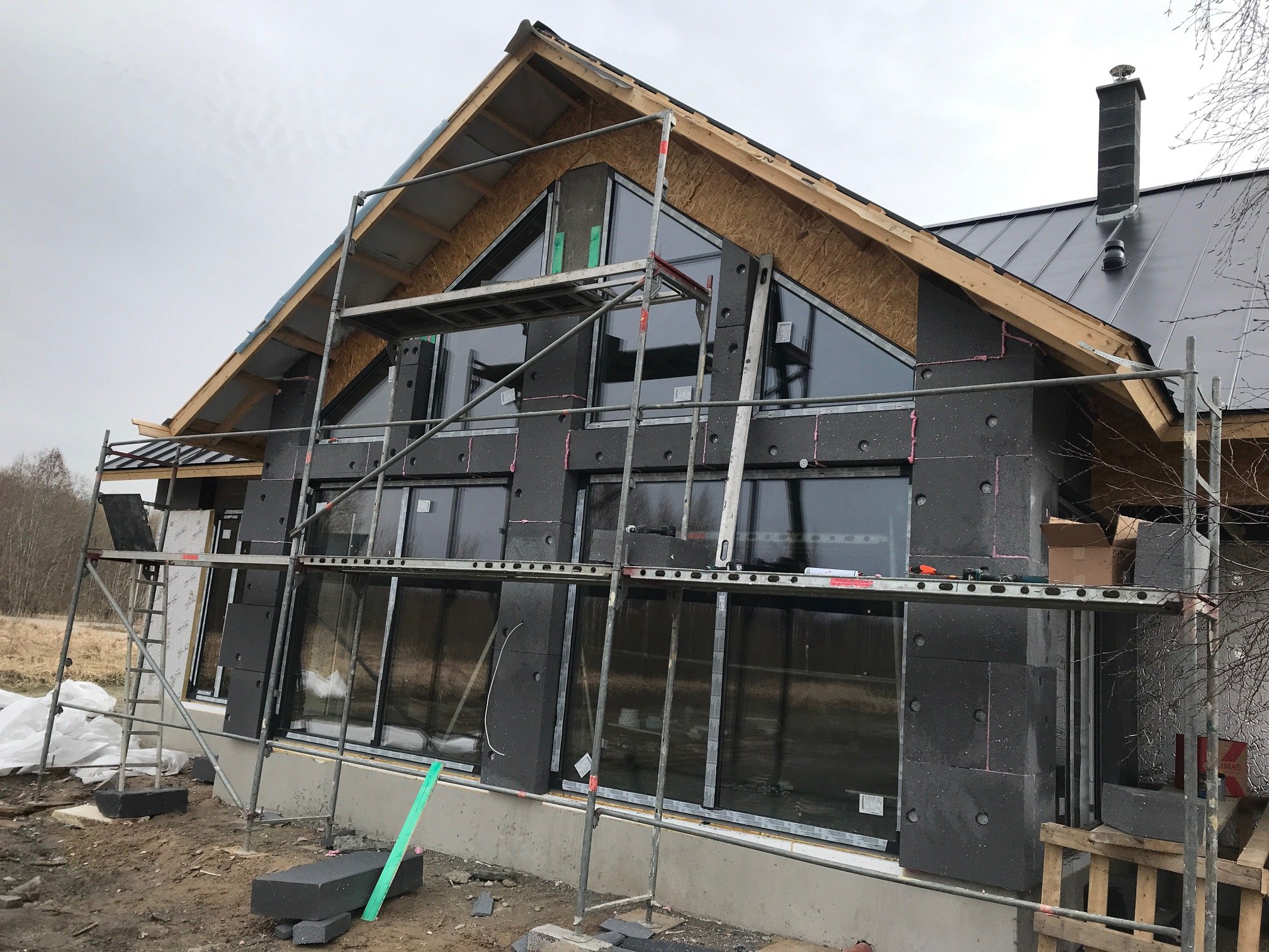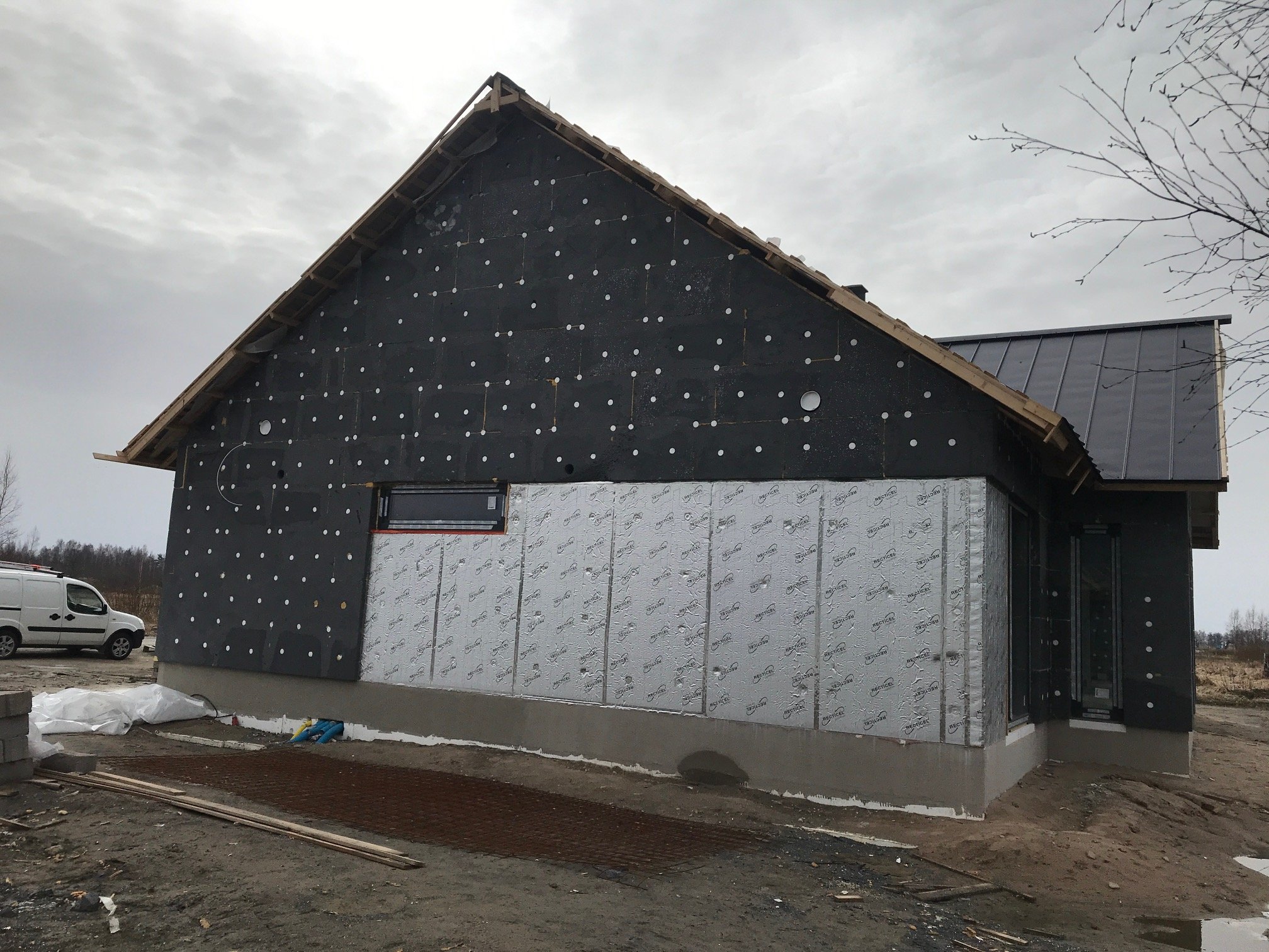 Seinad on soojustatud EPS Silver 200mm plaadiga. PIR soojustusega pinnad kaetakse laudisega aga nende alade servad peab samuti viimistlema krohviga (soojustuse paksuse erinevus on 50mm). Aknaraamidele paigaldada halli värvi profiilliistud. Sokli ja seina vahel profillliist puudub. Tellingute paigaldus tellija poolt.