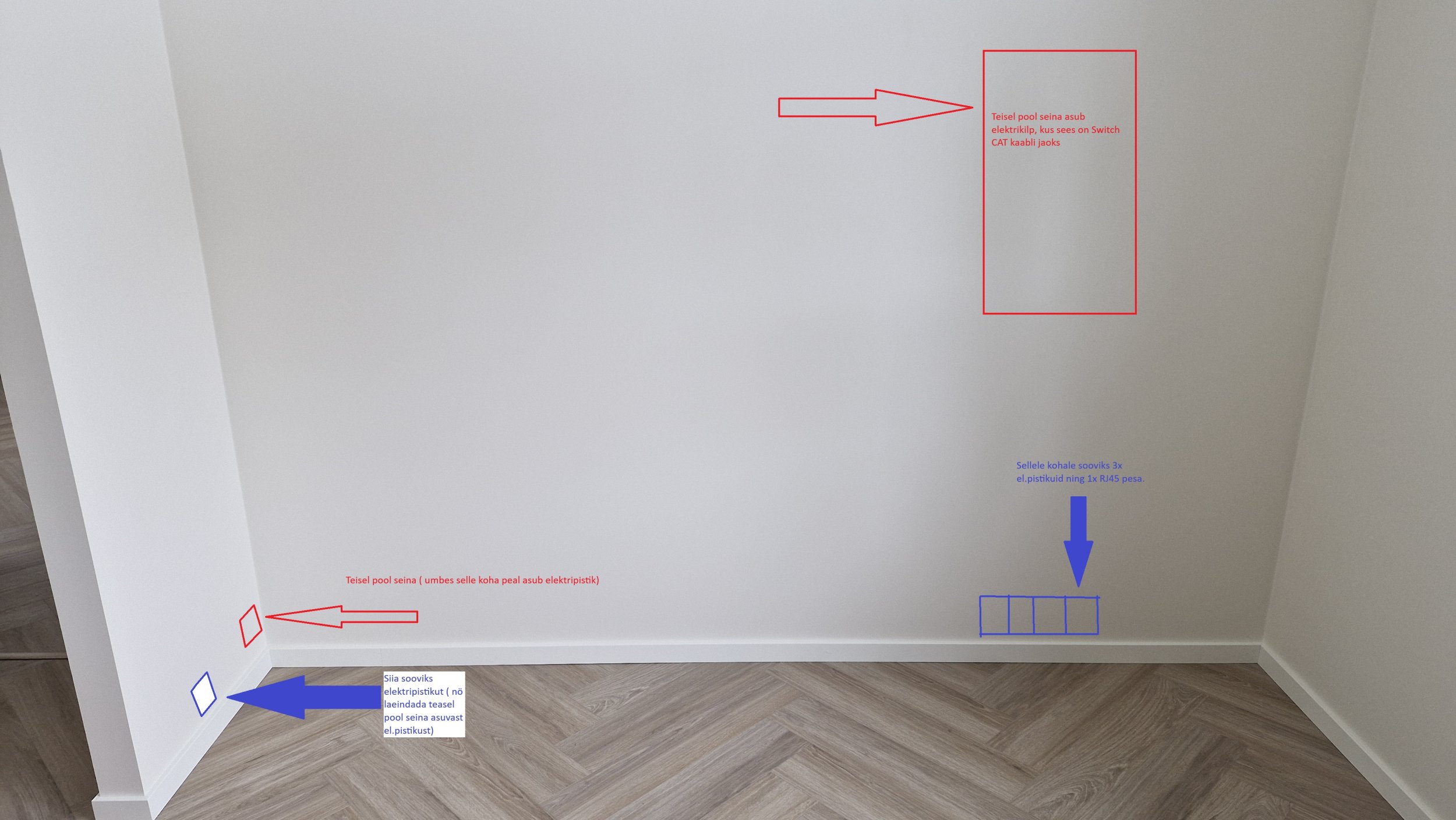 Sooviks pakkumist väikesele elektritööle. Asukoht on Raasiku alev, Raasiku vald, Harjumaa. Töö visualiseerimiseks on tehtud foto ning joonisatud peale töö sisu. Seinad on karkassil ühekordse kipsplaadiga. Joonisele on märgitud punasega elektrikilbi ja pistiku asukoht, mis asub teisel pool seina ning kust saaks vedada uue kaabli. Sinisega on märgitud enam-vähem asukohad, kuhu sooviks uusi pistikupesasid. Kokku sooviks saada 4 el.pistikut ning ühte internetipistikut (RJ45).