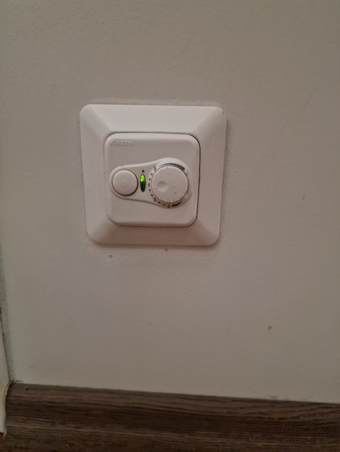 2. Vaja on välja vahetada põrandakütte termostaadi lüliti (pildil). Töötab, kuid teeb valju plõksuvaid helisid. Põrandaküte iseenesest töötab. Termostaat asub teisel pool vannitoa seina, kuhu vajalik paigaldada seinakontakt koos ühendusega!