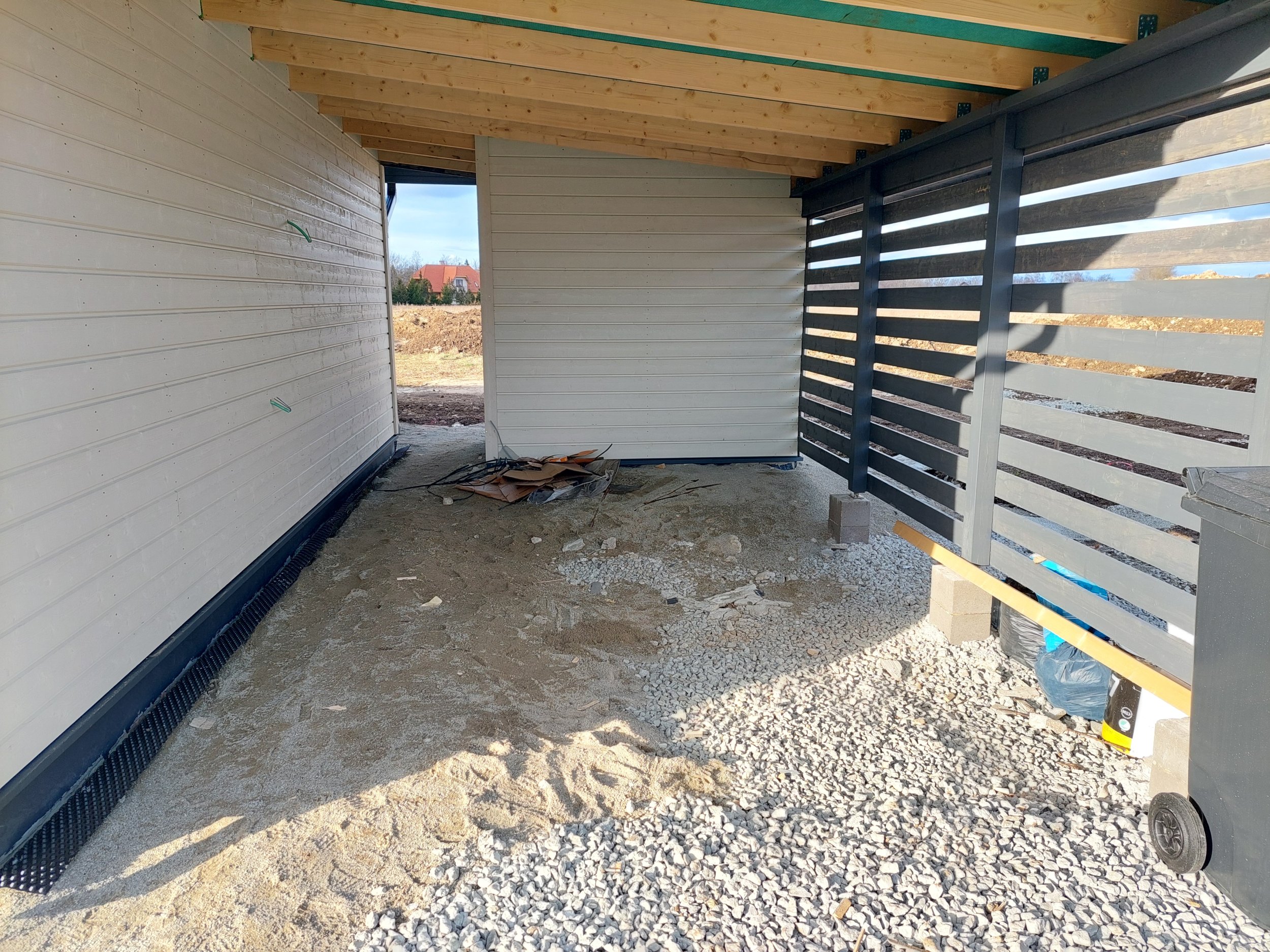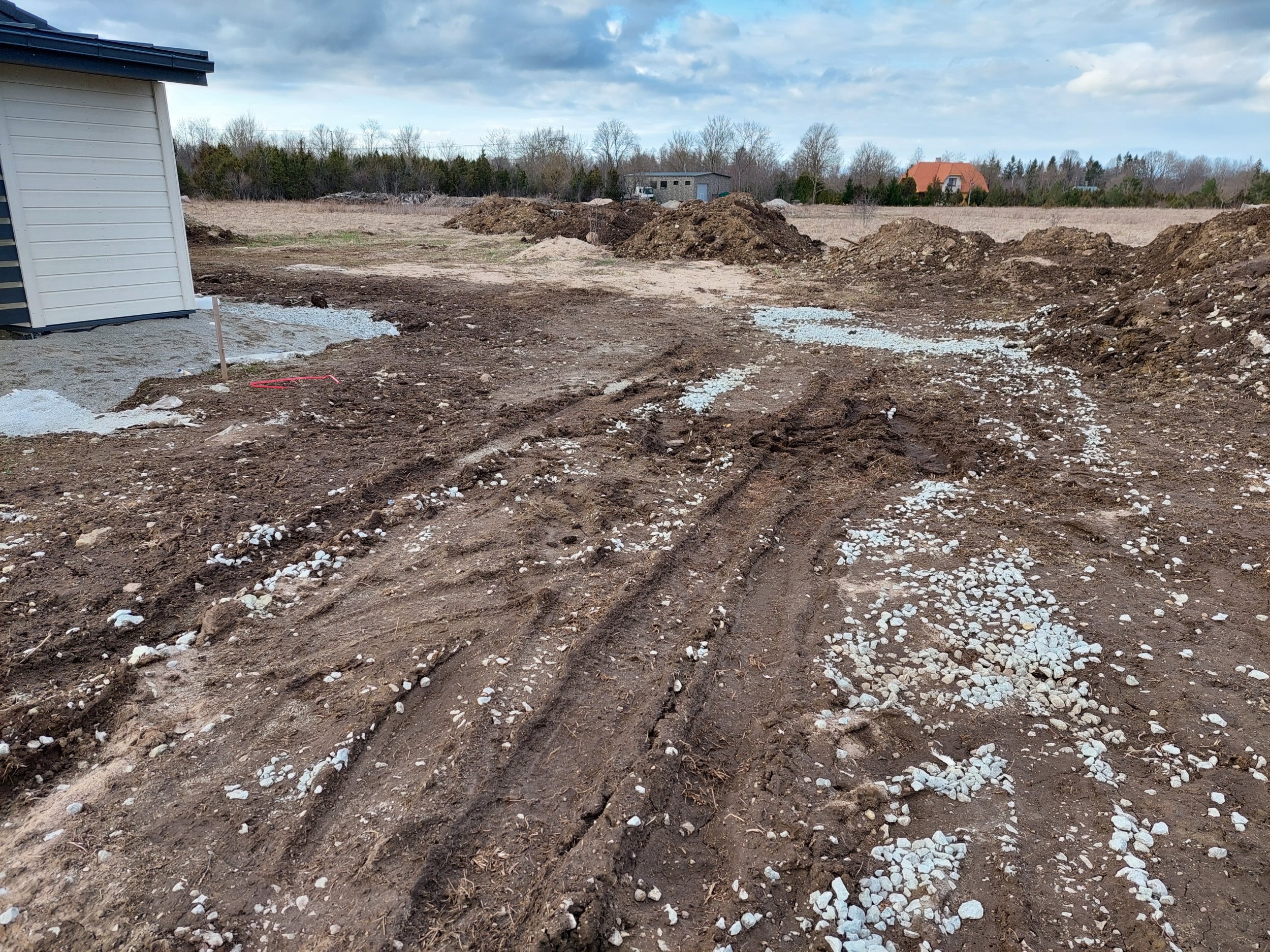 Tumesinisega ala, mis on vaja paekivini paljaks koorida (kuni ca 0,5m), ära täita ja kruus peale. Täitematerjaliks saab kasutada krundil olevat välja lõhutud paekivi. Kokku ca 104 m2, millest 14 m2 peale tahaks kiviplaati vms, et saaks ilma põrandata kuuri püsti panna.