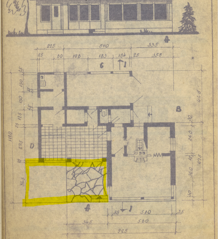 Soov ehitada immutatud puidust terass, mis ulatuks maja otsani. Olemasolev vana kivikattega terass võib jääda selle alla toeks. Vanalt maja skeemilt näeb täpseid mõõte.