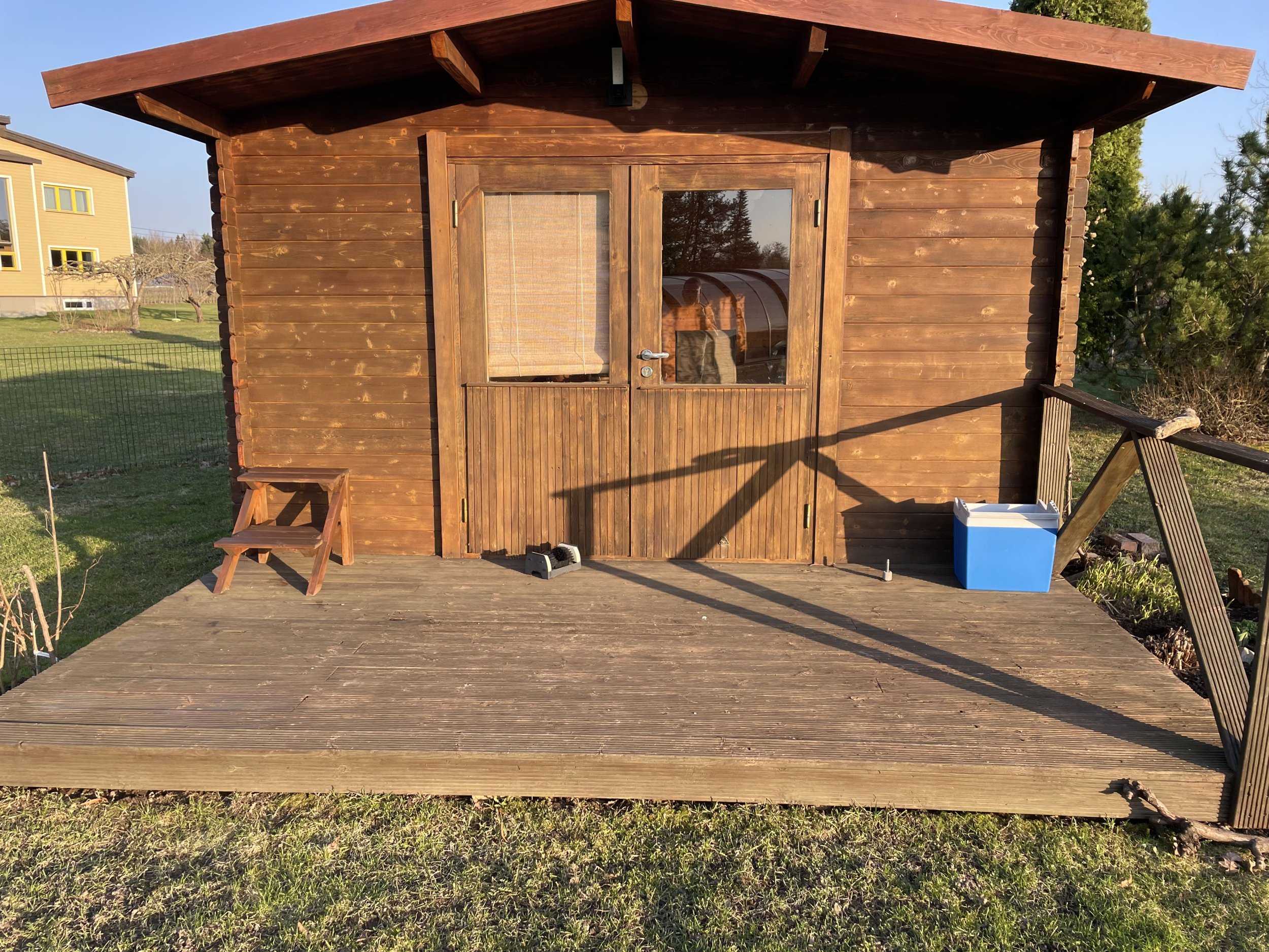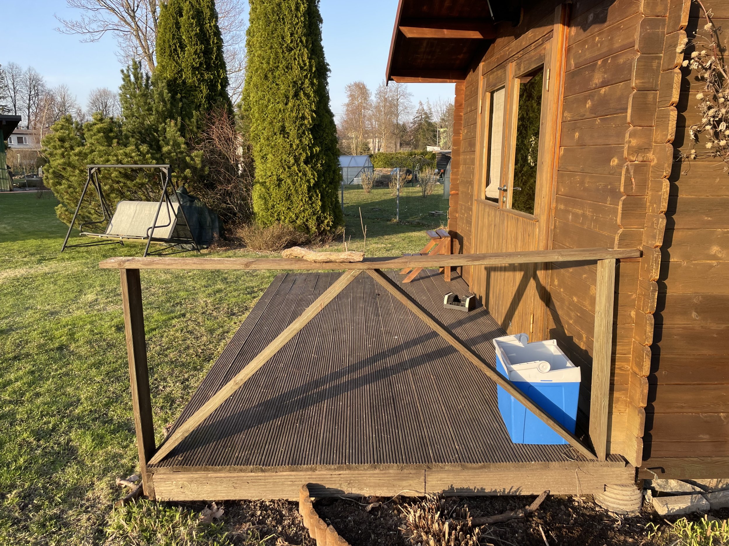 Eemaldaksime vana terassi . Otstesse valaks 2 kannu tugipostide jaoks et saaks katust pikendada ja oleks katusel kuhu toetada. seejärel fiboga ujuv terass |