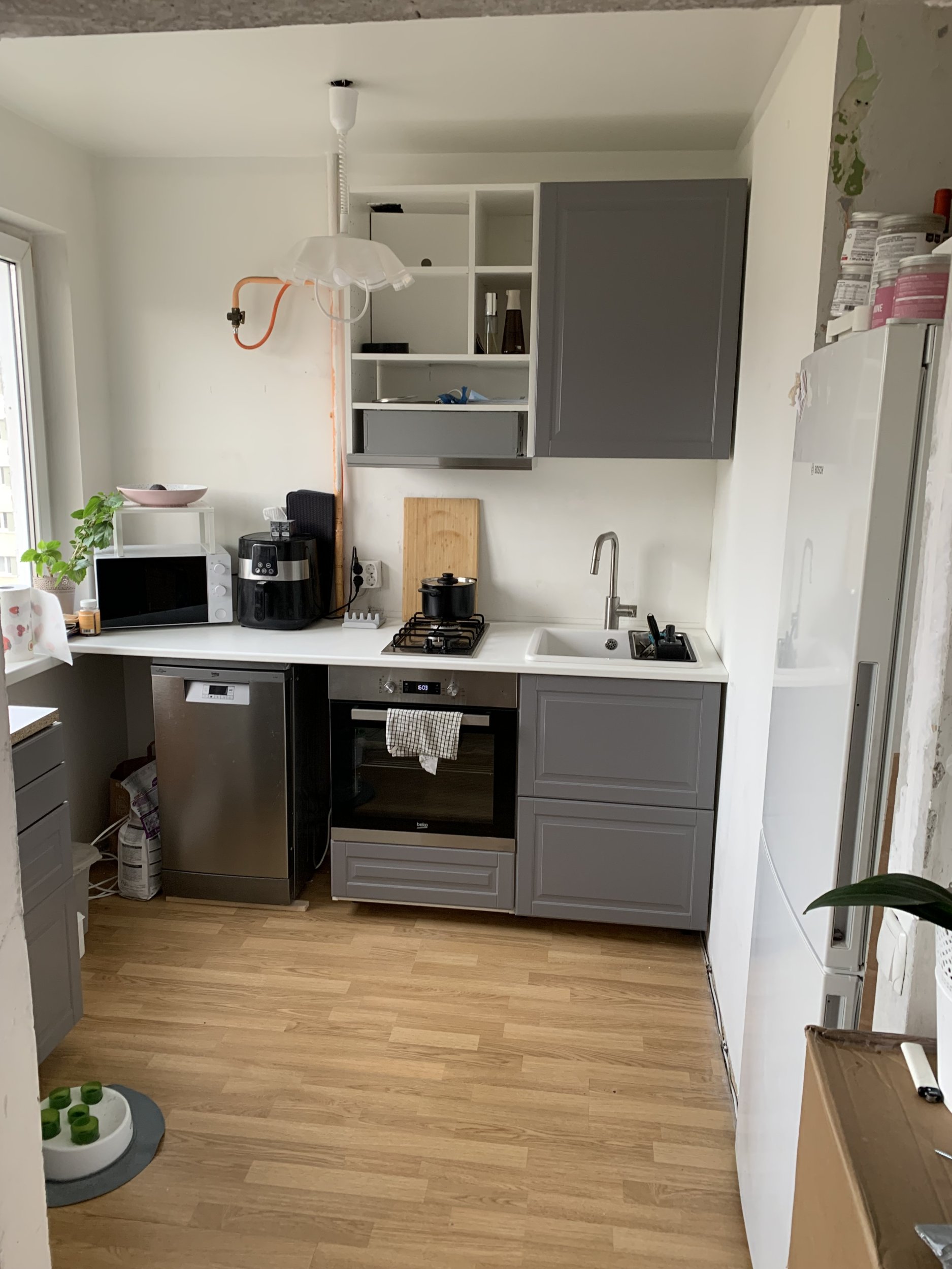 Vaja on paigaldada ülemised 2 kappi ja vasakul olev tasapind. Tasapind vaja kinnitada ajutiselt, sest majal tuleb akente vahetus. Kappe on vaja lõigata nii, et gaasitoru kappi jääks. Mingisugused tööriistad on olemas, aga kindluse mõttes oleks ideaalne oleks kui töö tegijal need kaasas oleks.
