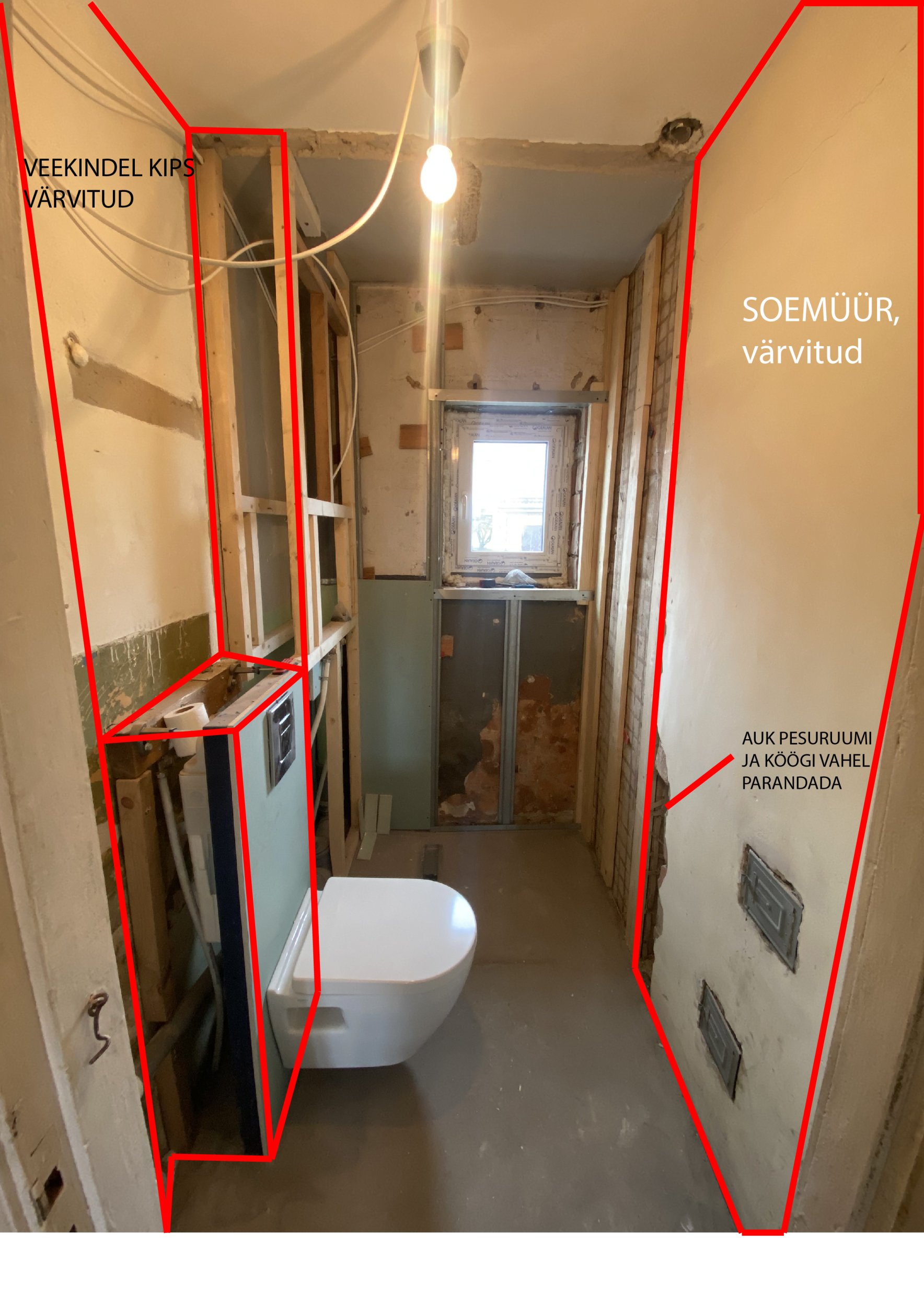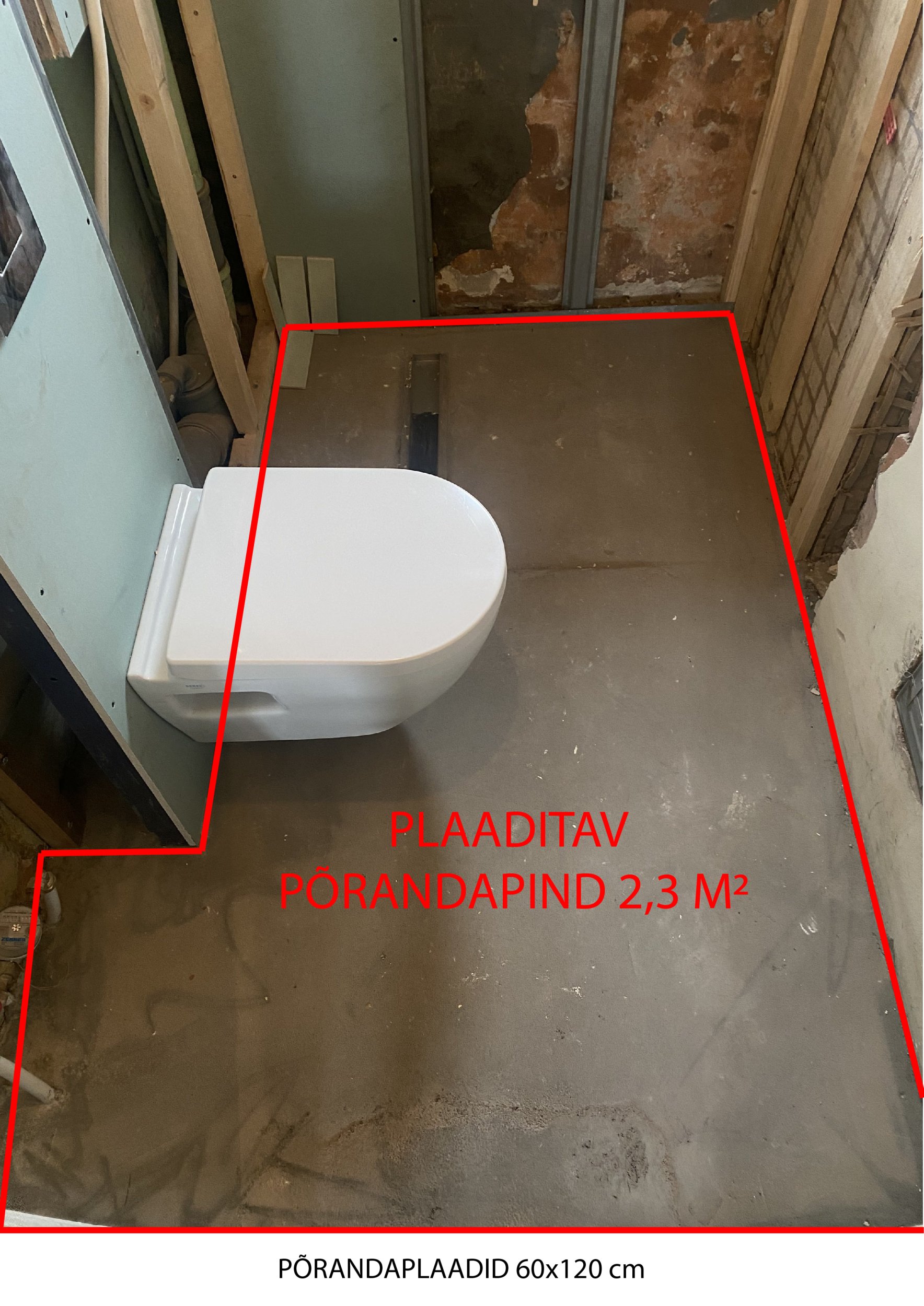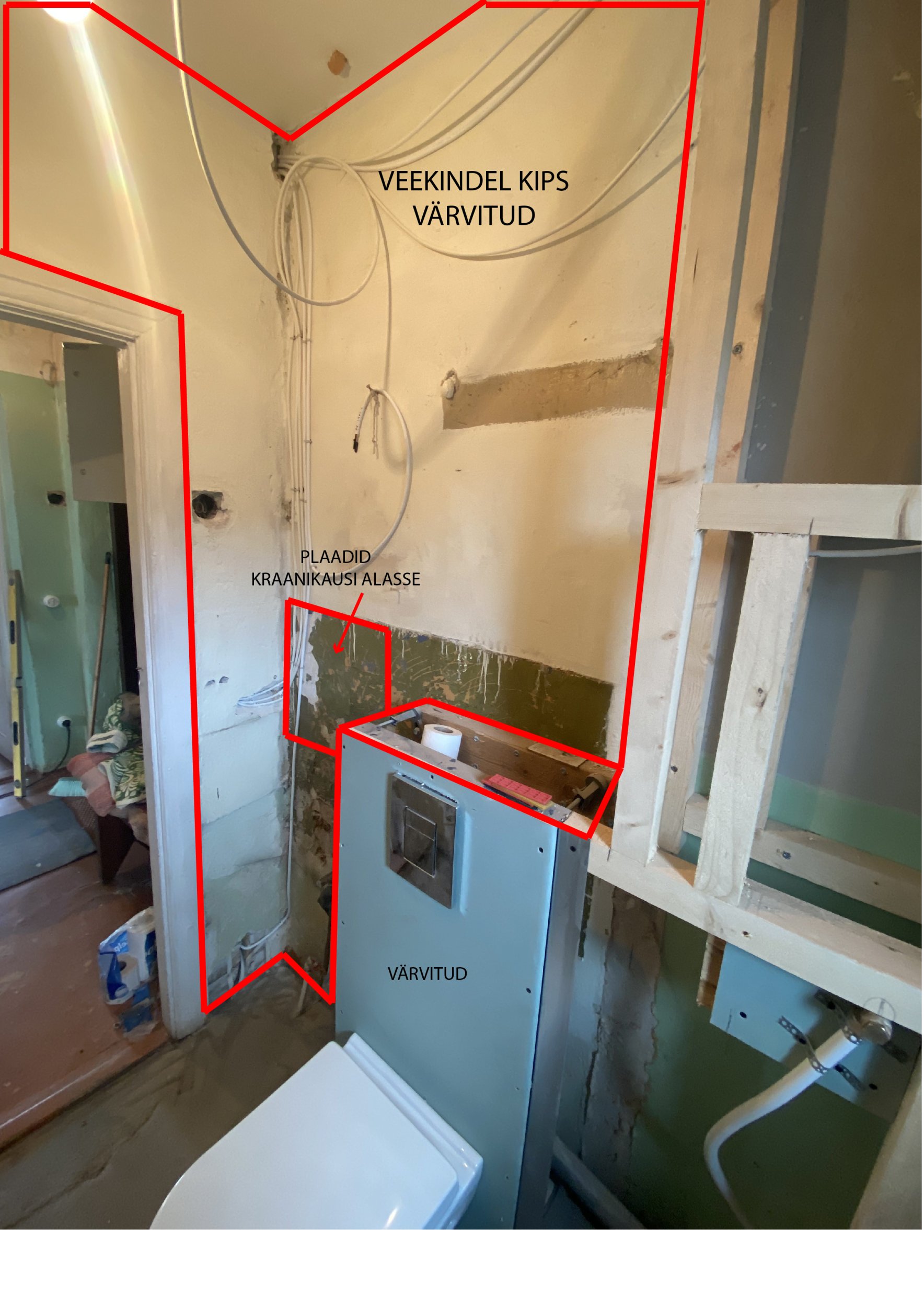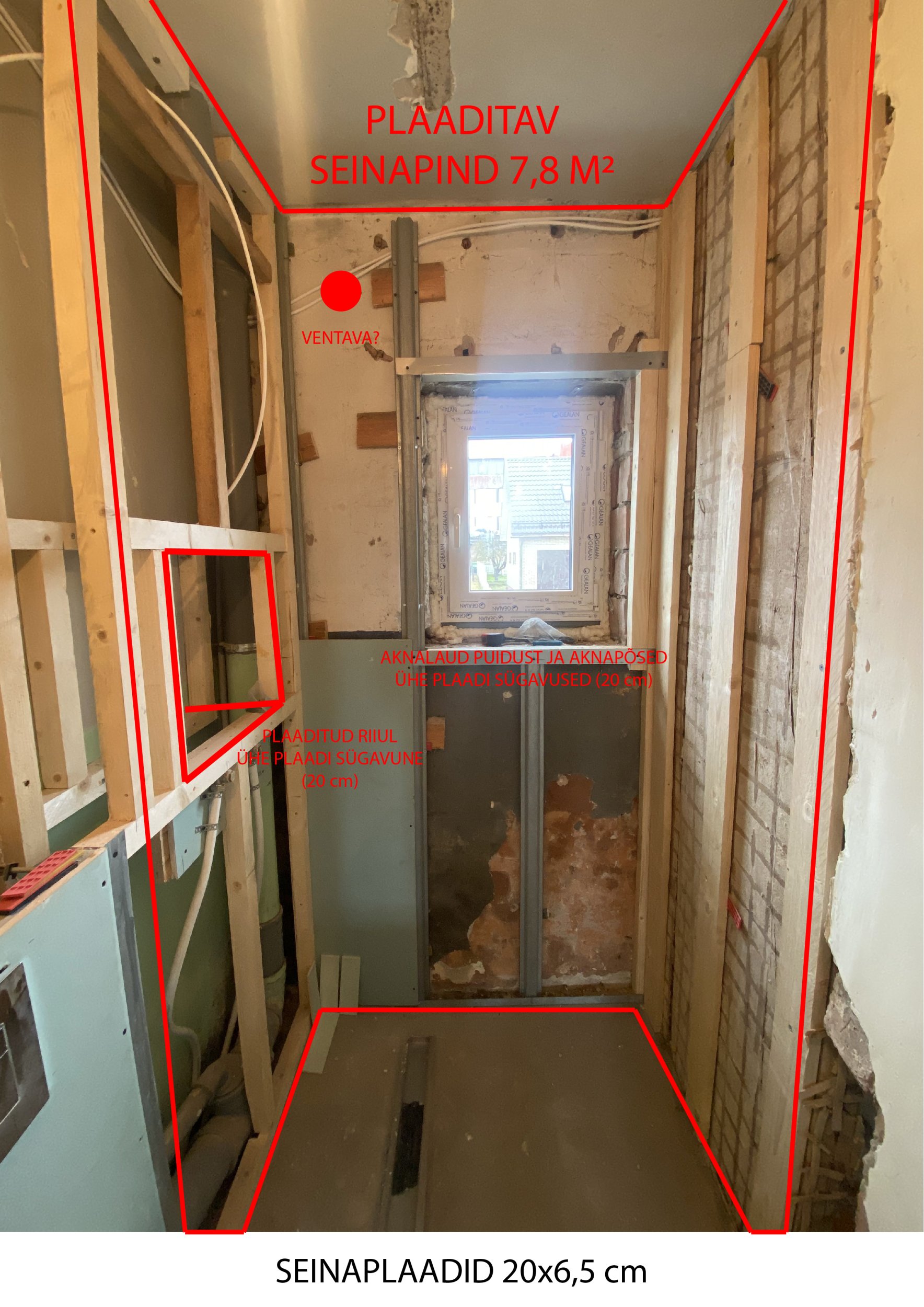 Veekindla kipsi, hüdroisolatsiooni ja plaatide paigaldus pesuruumi. Pool ruumist on planeeritud plaadid ja pool veekindel värvitud kips. Pesuruumis paikneb ka soojamüür. Ruumi kõrgus 245 cm. Lakke veekindel kips, värvitud. Seinaplaadid 20x6,5 cm, põrandaplaadid 60x120 cm (trapi juures saab teha vajalikud sisselõiked, et säilitada põrandakalle?). Keraamilised plaadid, vuugisegu ja värv, aknalaud töö tellija poolt. Asukoht Haapsalu linn, Võnnu tänav, 1. korrus.