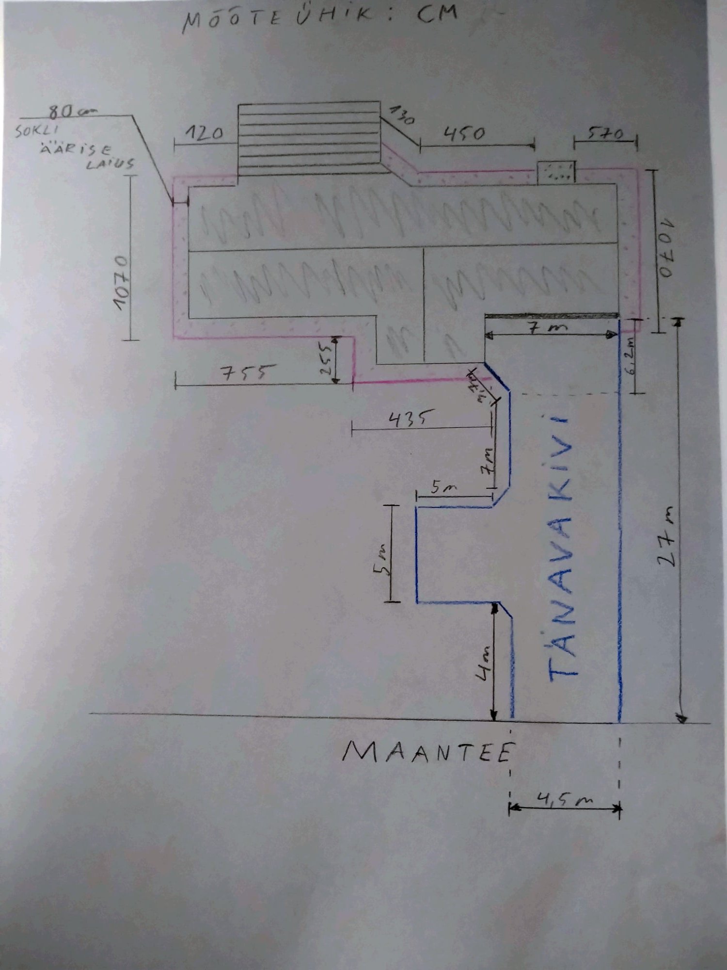 2) Roosaga märgitud ala, mis tuleks majasokli ümber soovin graniitkillustikuga täita ( ainult musta kiviga graniitkillustik, et ei oleks punast kivi sees vms) ja äärde panna musta äärekivi)
