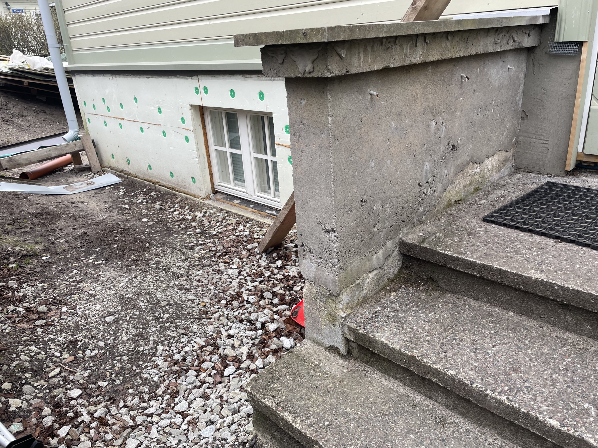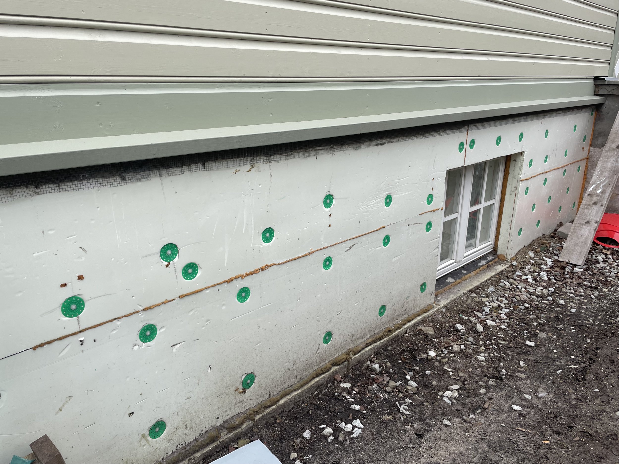 Maja välisseinad on sojustatud XPSiga, osa on laotud plokkidest, osa on betoonsein, osa sai üks kord juba krohvitud. Uksed ja aknad on paigaldatud, veeplekid on paigaldamata (saab vajadusel paigaldada enne tööde algust). Tööde teostaja peab hoidma uksed ja aknad kahjustamisest ja määrimisest.
