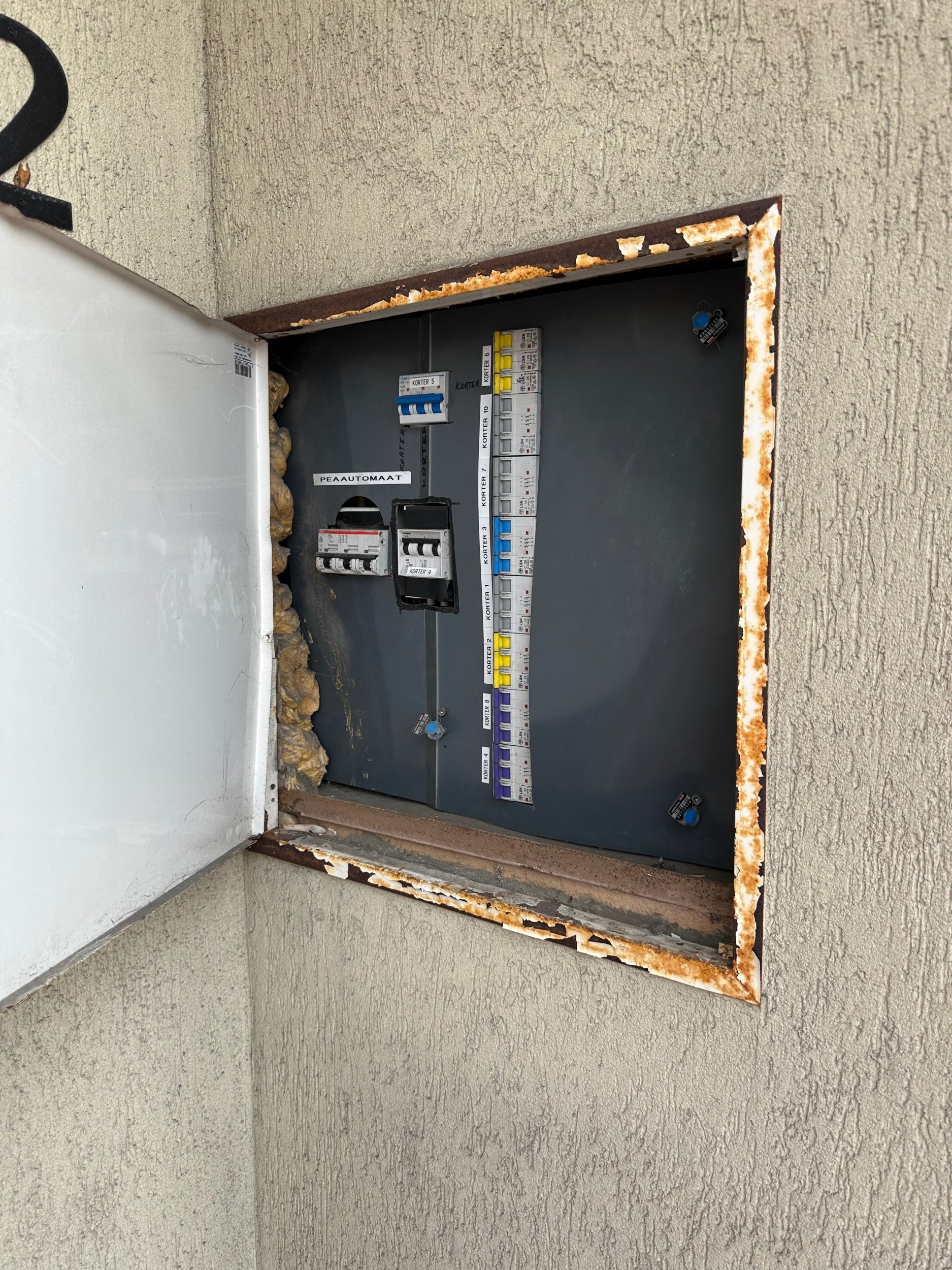 Hetkel on kilp esimese trepikoja välisukse kõrval, õues. Liitumispunkt on posti otsas, maja kõrval. Kilbi peakaitse on 125A ja kilbis on igal korteril oma kaitse suurusega 16-32A. Arvestid on igal korteril toas sees.