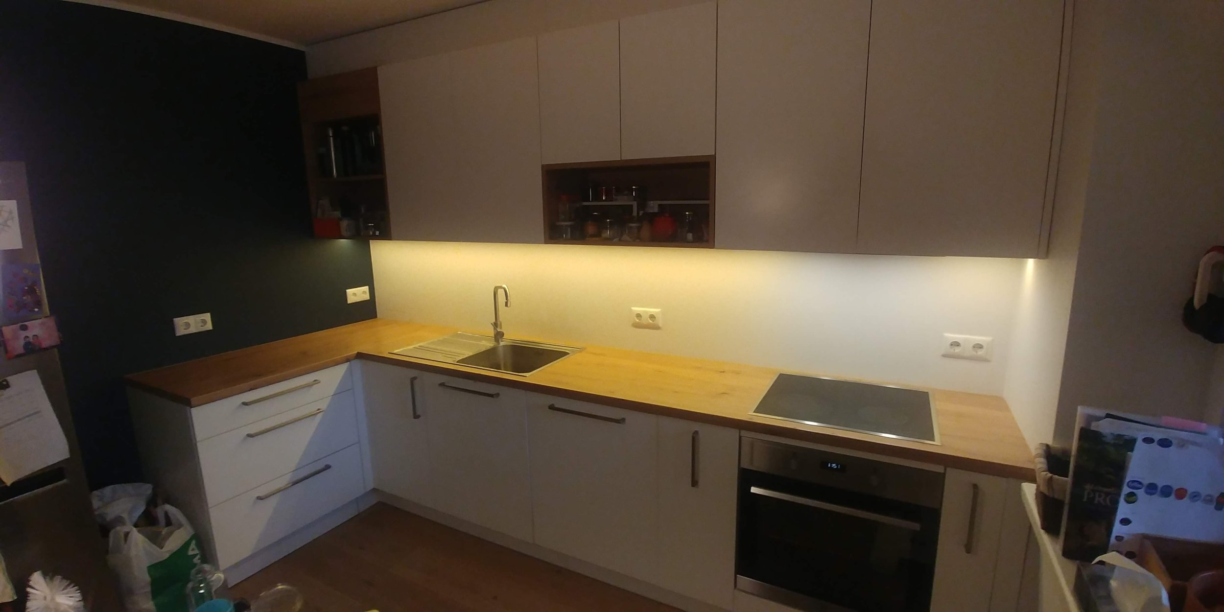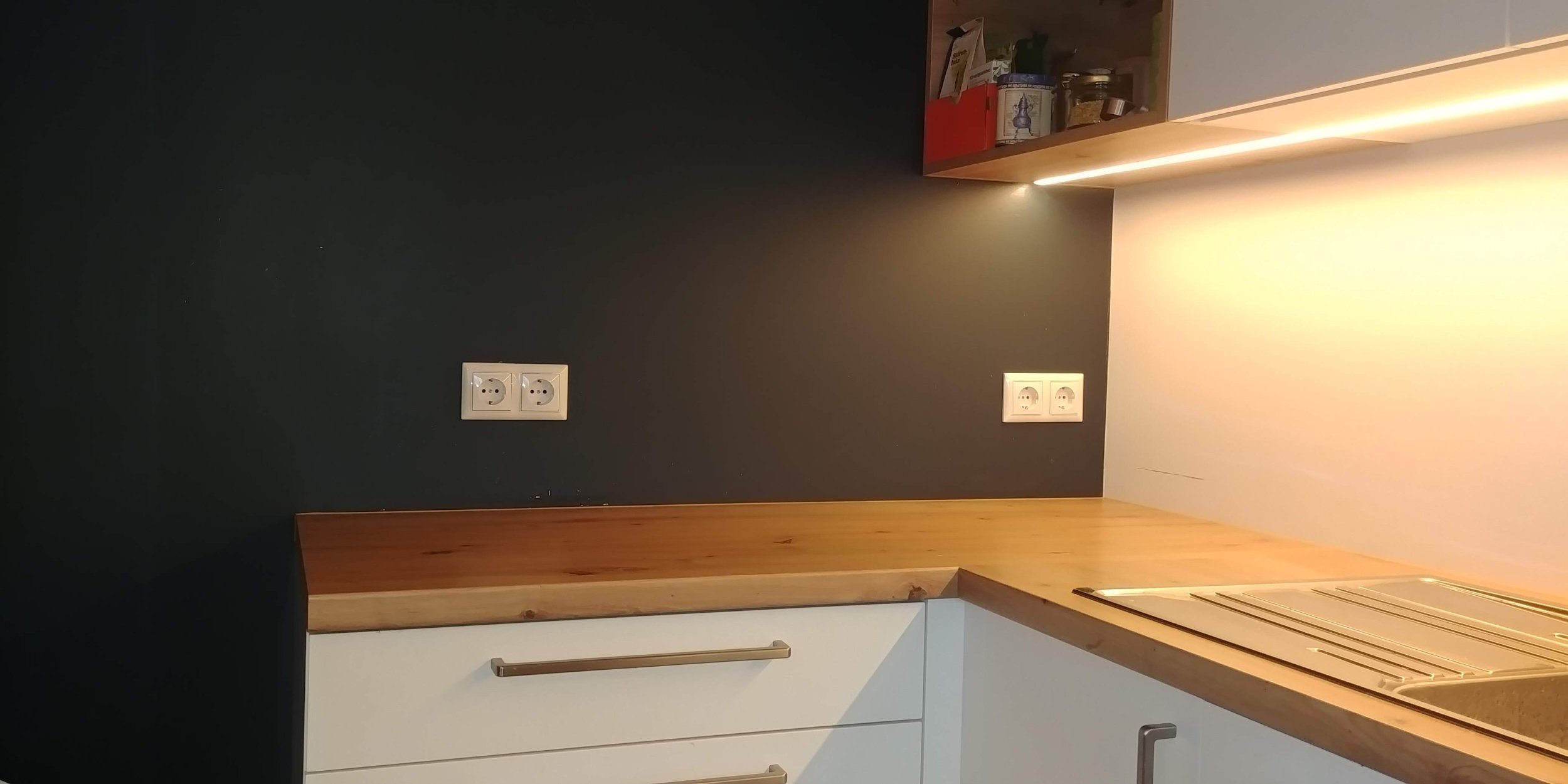 Köögi tasapinna kohal asuva L-kujuga seina plaatimine. Plaaditavad pinnad 54 x 133 ja 54 x 334 cm. Keraamilised plaadid ja vuugisegud (sinine ja hall) on olemas. Plaadid on mõõtudega 31,2 x 79,7 ja 60 x 60 cm. Viimased lähevad suuremale seinaosale. Seintel on kokku 4 pistikupesa.