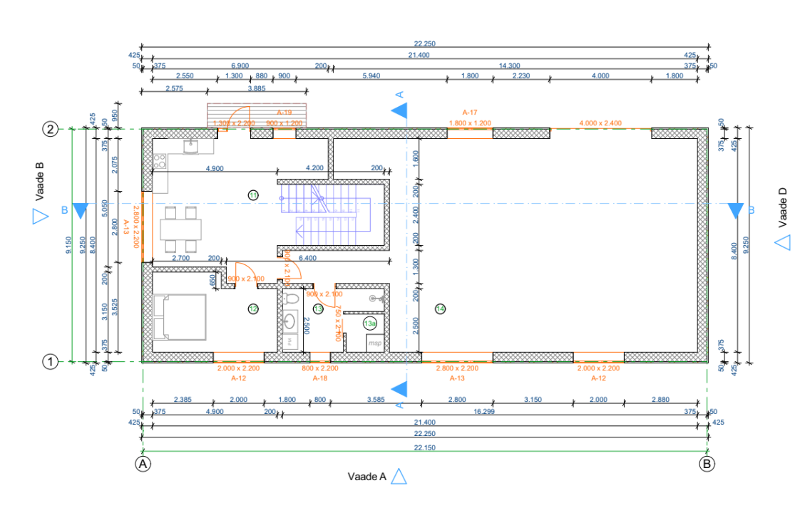 Eramaja siseseinad kokku 170 m2 (millest 35m2 esimesel korrusel). Betoon õõnespaneelidest vahelagi, betoonist trepp korruste vahel. Lae kõrgus 3m I korrusel ja 2.60m II korrusel. Kokku 12 ukseava tavamõõdus (90) ja 2 laiendatud ukseava (130) - ei kuulu arvestusliku pinna sisse.