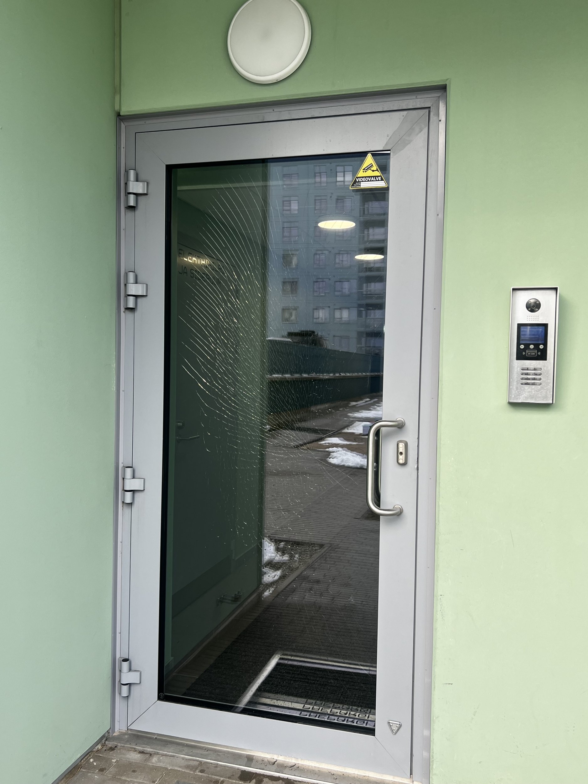 Majja sisenemisel on videofonolukk ja elektrooniline lukk, mille saab avada nii võtmega kui ka elektroonilise kiibiga või videofoniga. Klaasi tegelik suurus on 2020 x 840, kuid et vähendada selle purunemise tõenäosust, kaalume uue ukse paigaldamist sarnase, kuid väiksema klaaspinnaga. Arvestades, et ukse taga võivad olla nii lapsed kui ka täiskasvanud, oleks mõistlik säilitada klaasi kõrgus, kuid vähendada selle laiust 2-2.5 korda või leida alternatiivne lahendus. Klaas peaks olema läbipaistev, uks peaks olema +/- sama värvi ja tooniga nagu praegune.