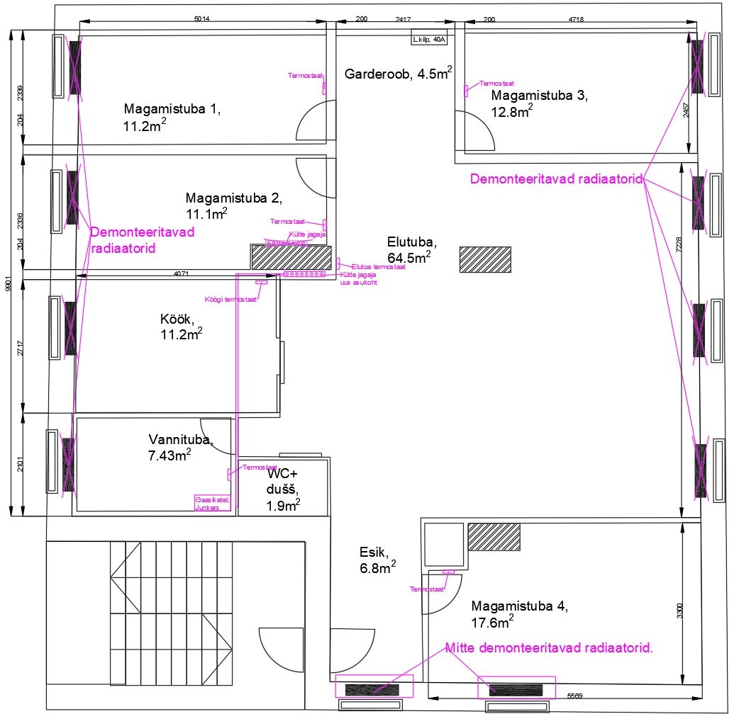Projekteerida igasse tuppa küttetorustik, mida soojendab gaasikatel Junkers CeraclassSmart ZWA (olemasolev). Iga toa temperatuuri peab saama seadistada eraldi termostaatidega.