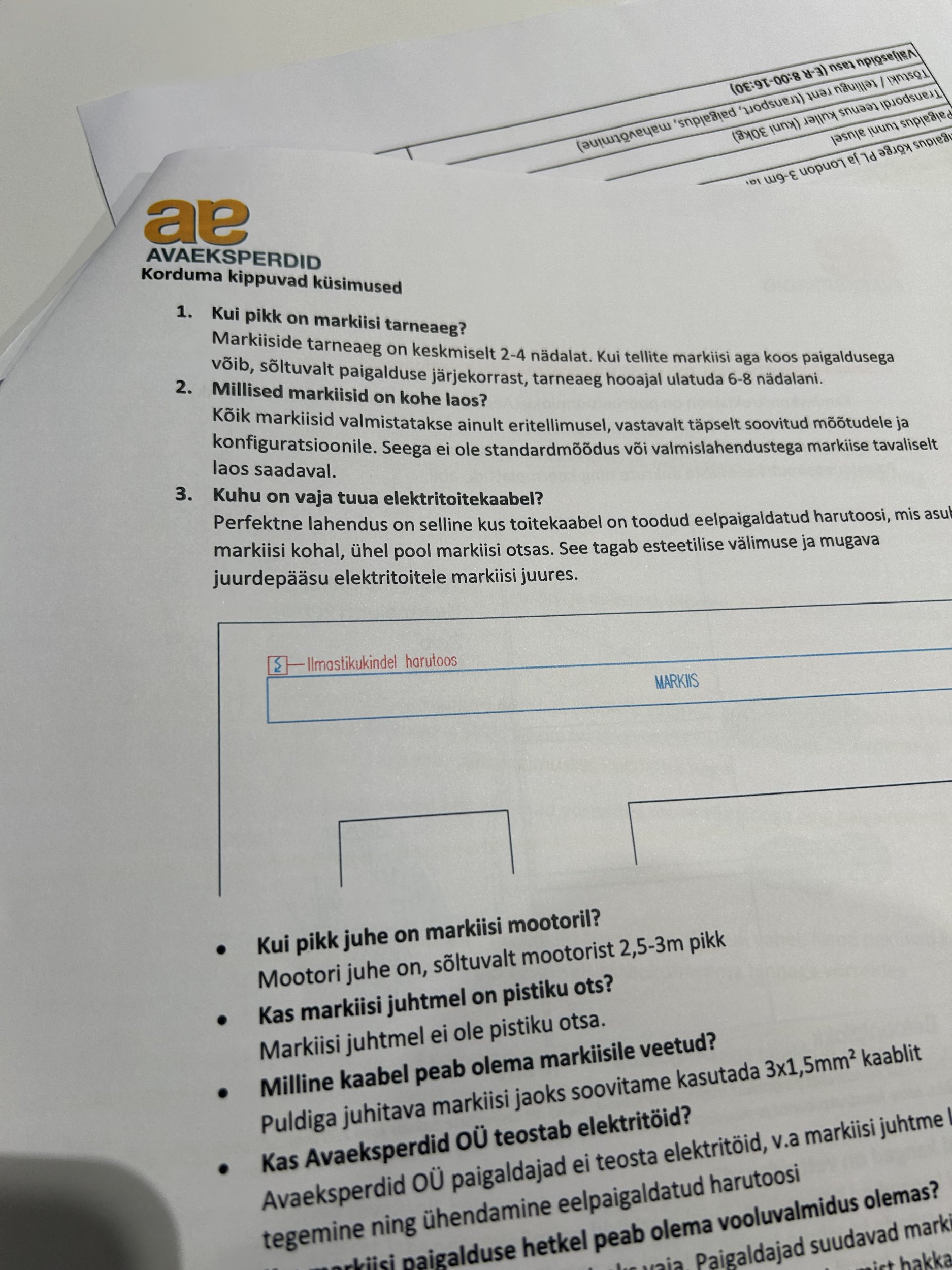 Markiisi jaoks soovitati toitekaabel paigaldada ilmastikukindlasse harutoosi.