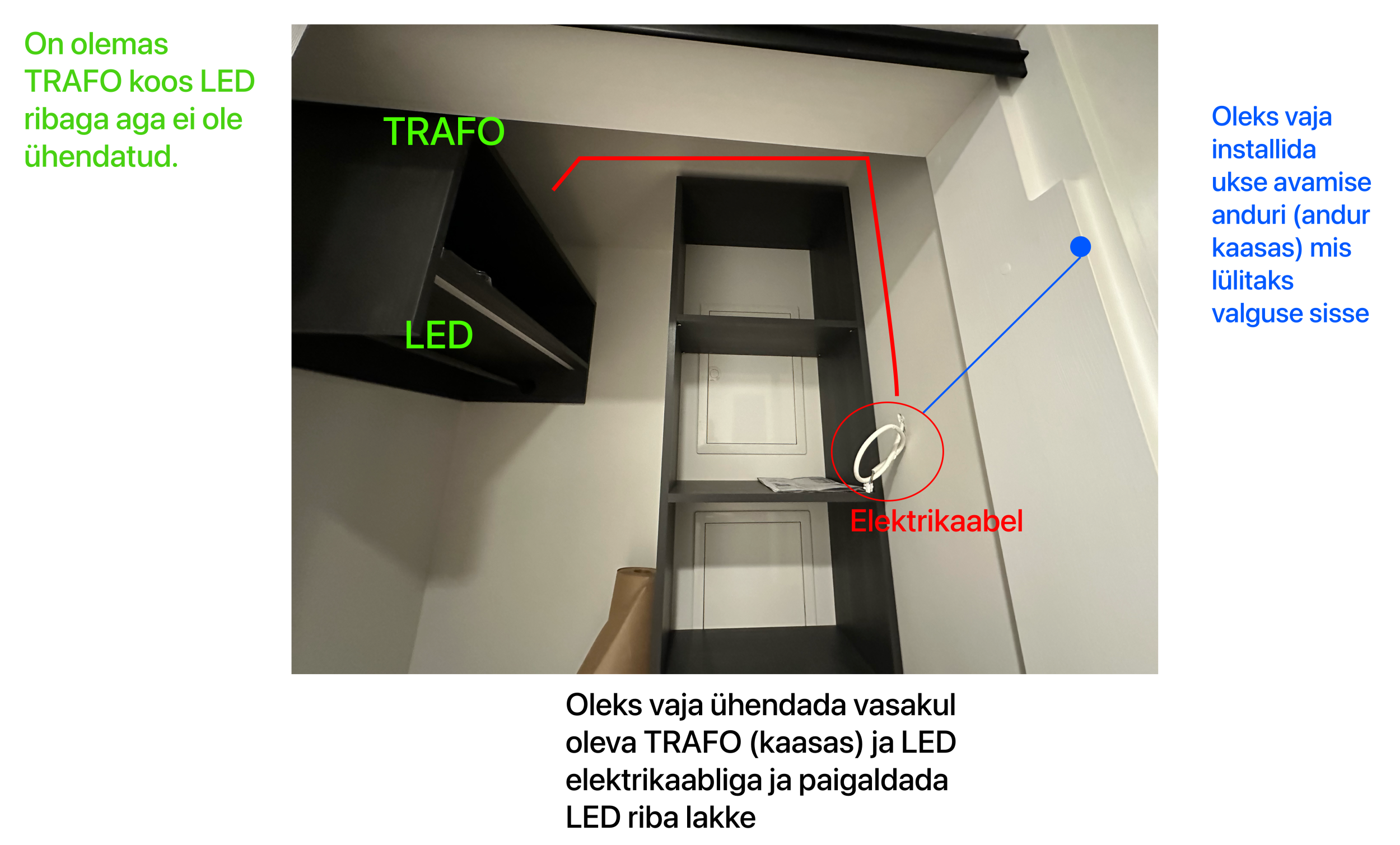 - paigaldada ukseavamise andur ja ühendada trafoga, et ukse avamisel lülitaks valguse sisse/välja